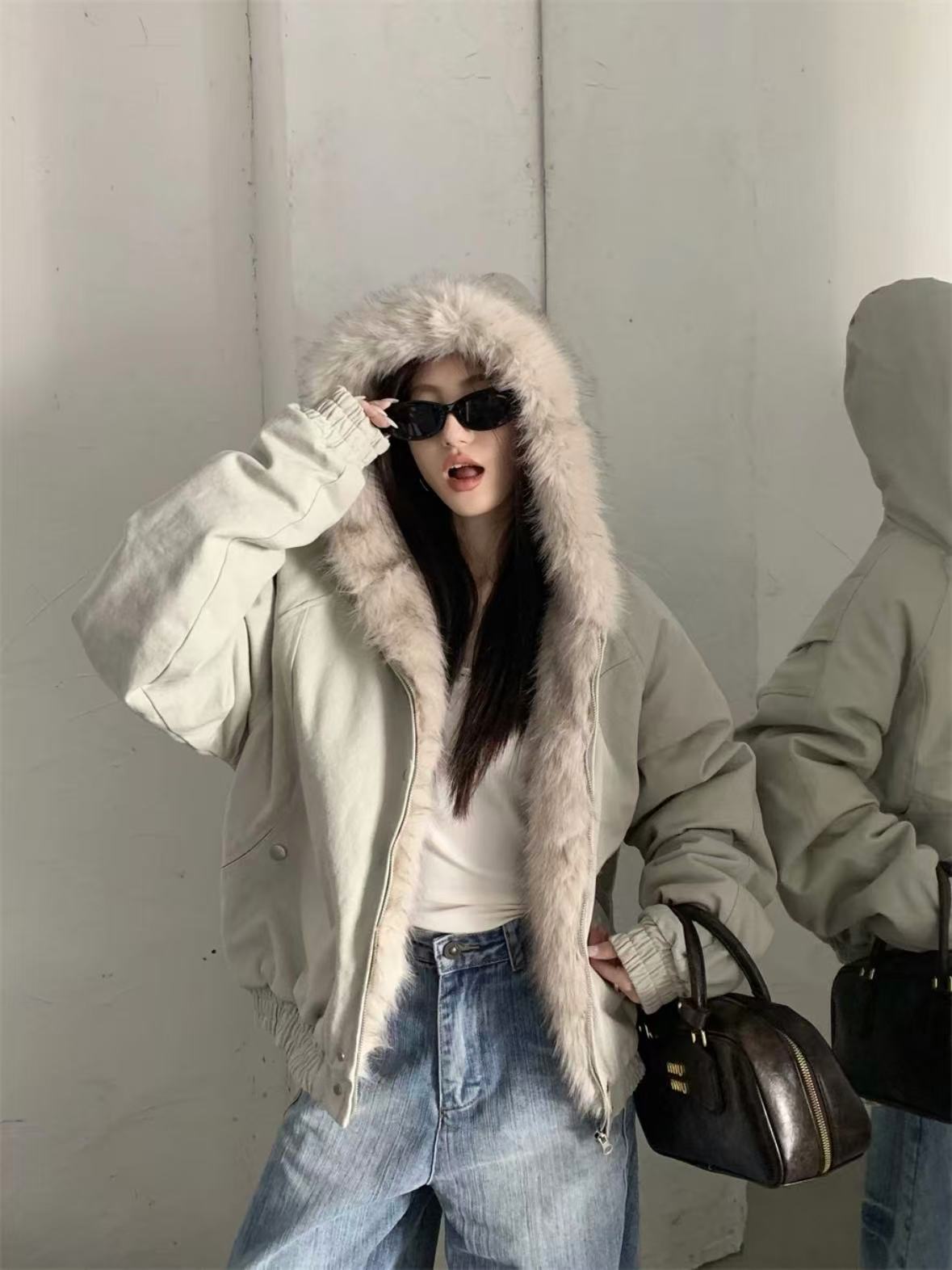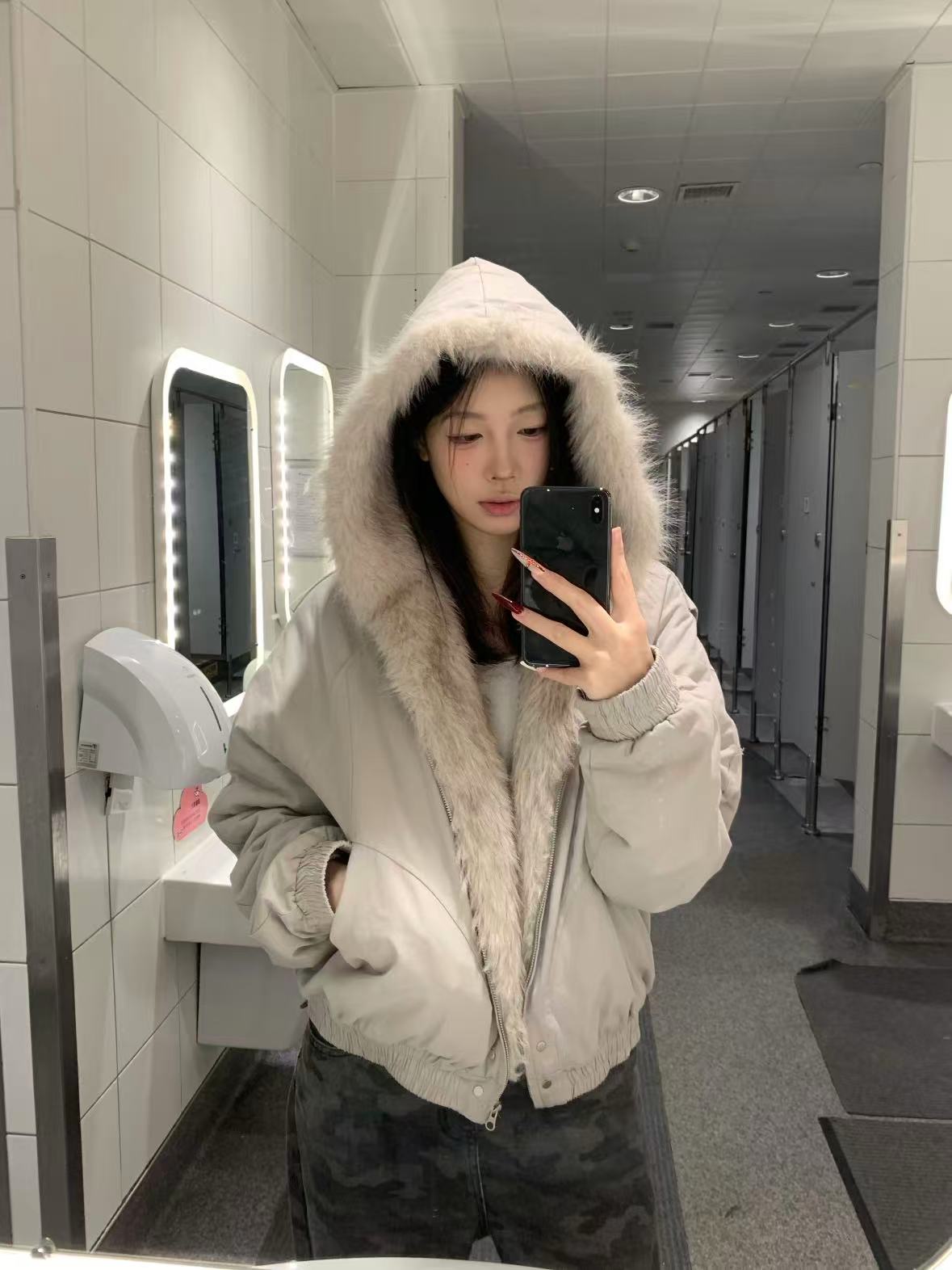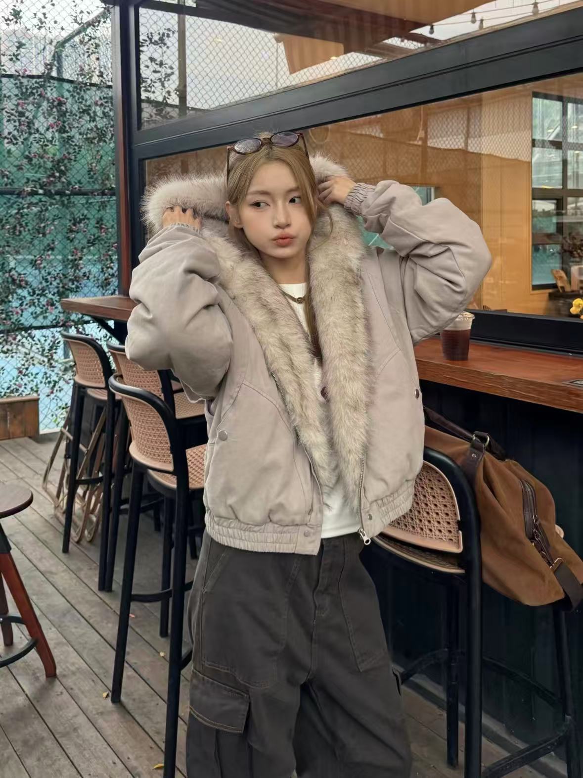 ふんわりとしたフェイクファーのフードがポイントのショートジャケット。