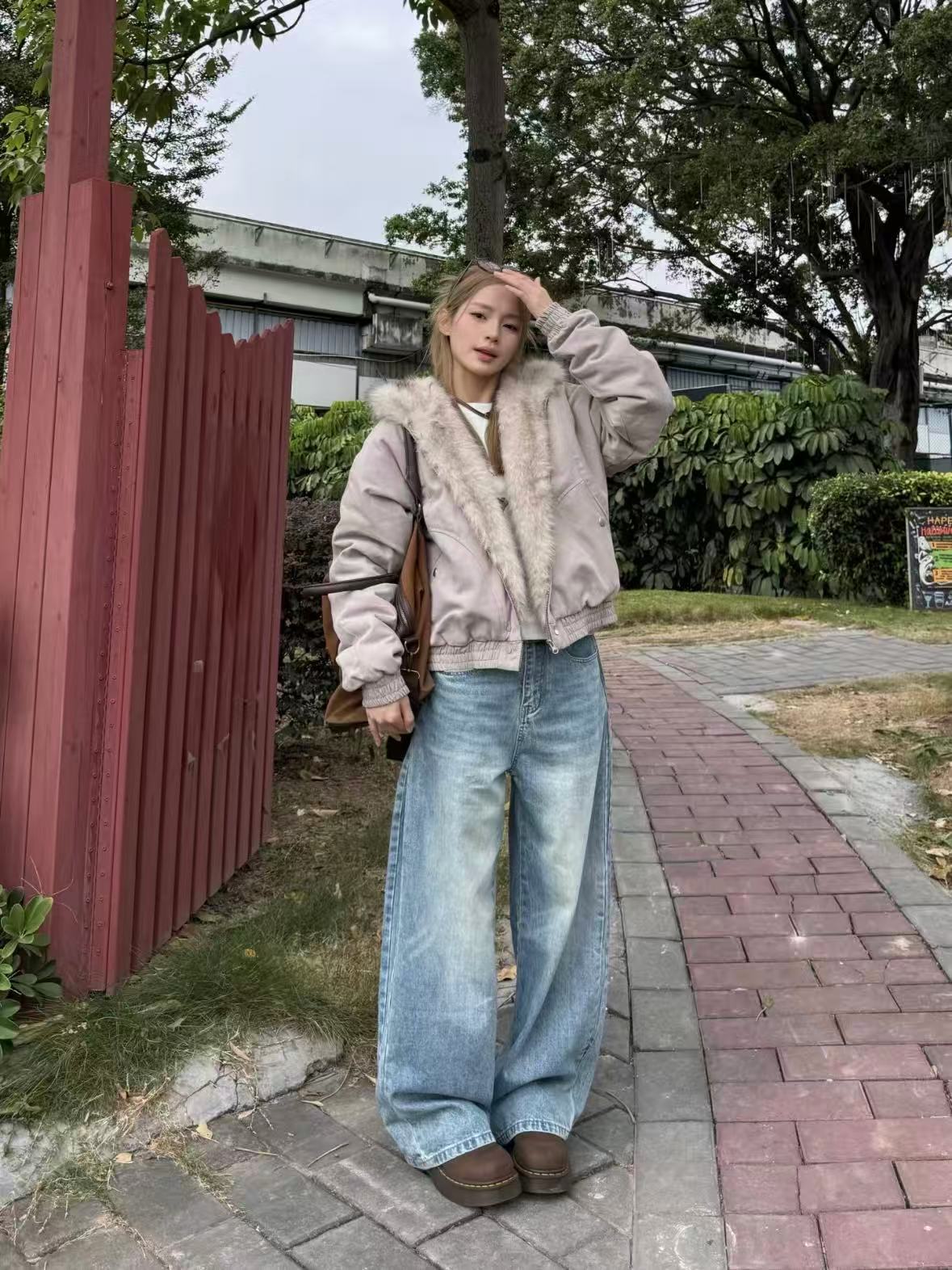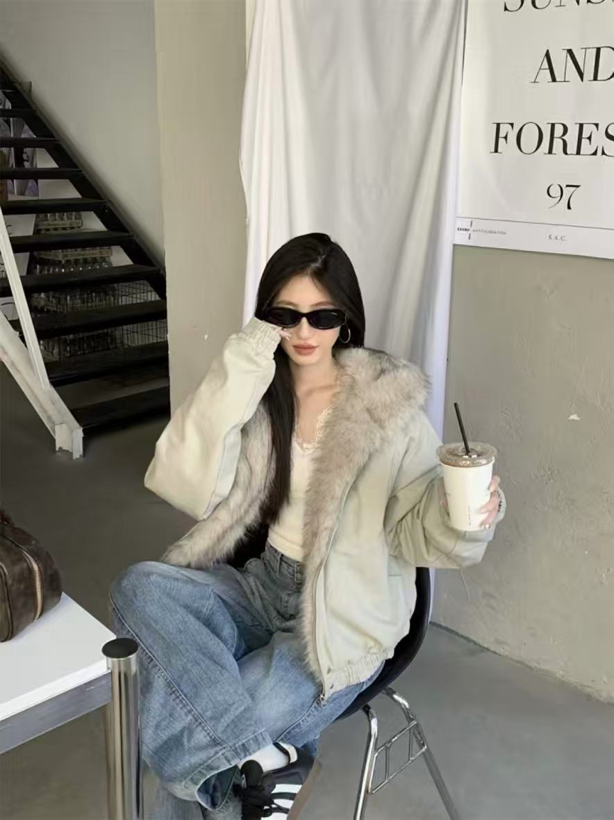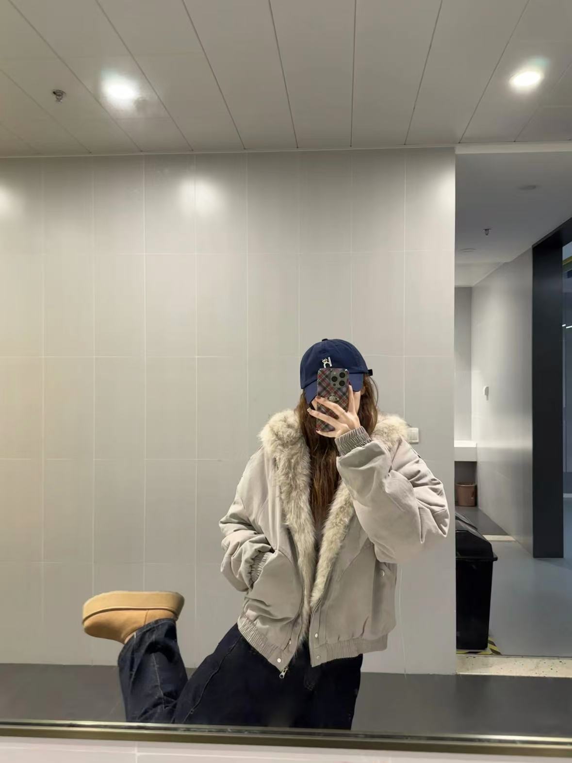 ふんわりとしたフェイクファーのフードがポイントのショートジャケット。