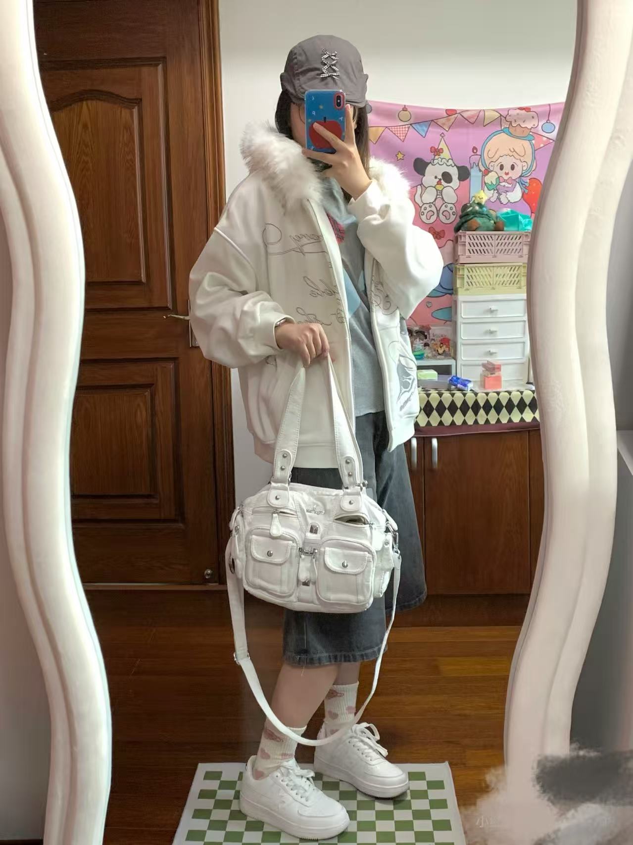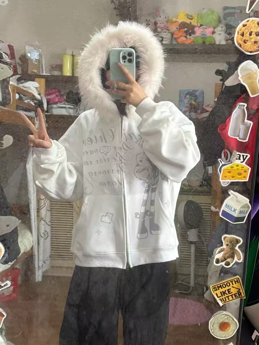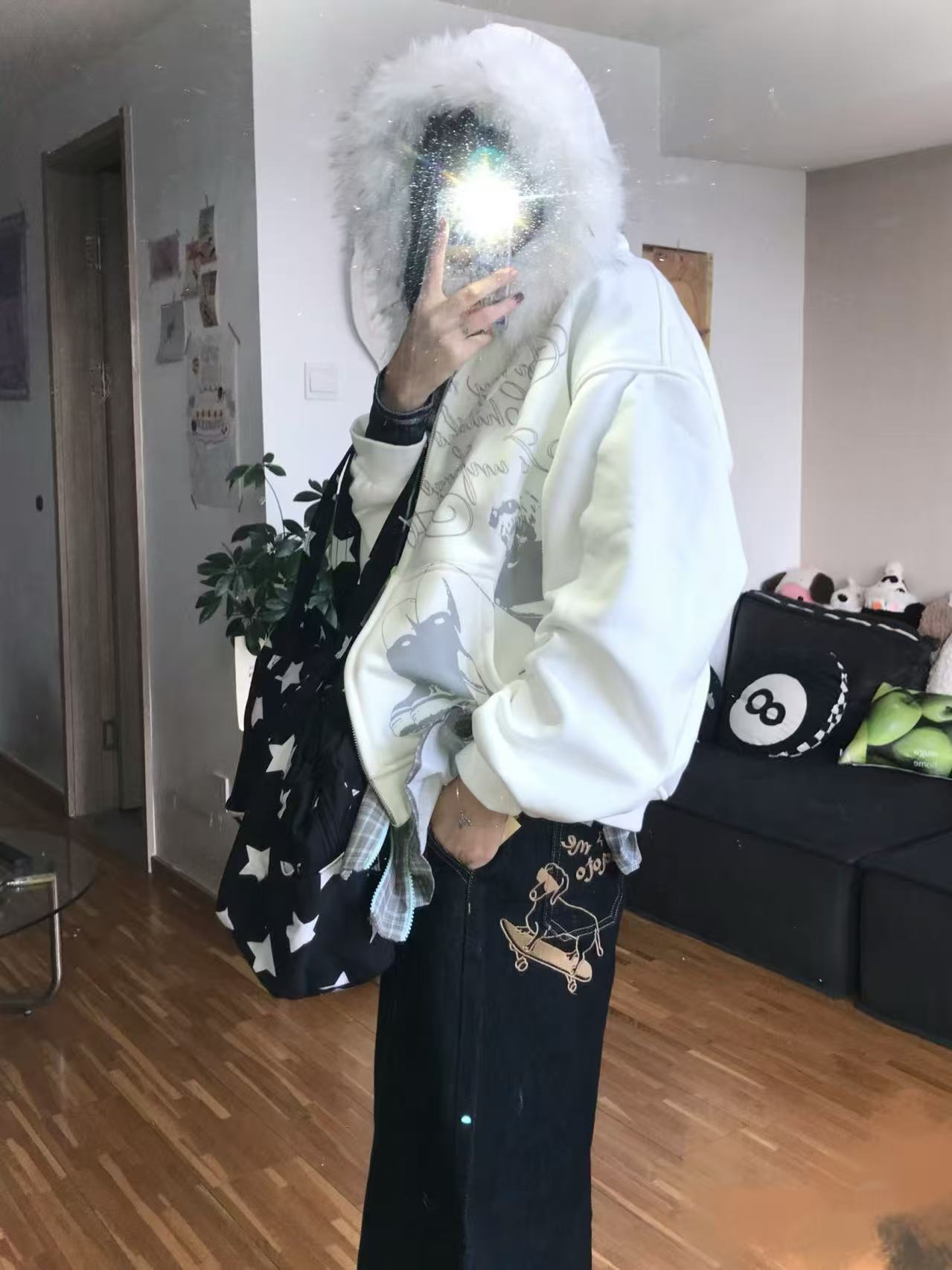 The cartoon embroidery design adds a playful anime feel to the casual look.