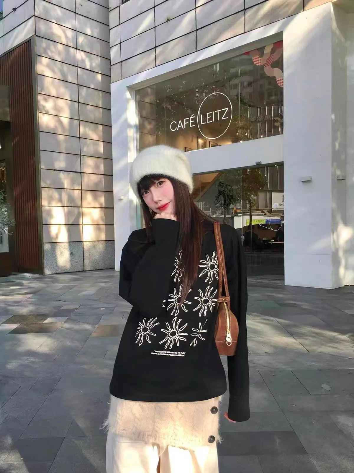 A relaxed long-sleeved T-shirt with a striking, soft sunflower print.