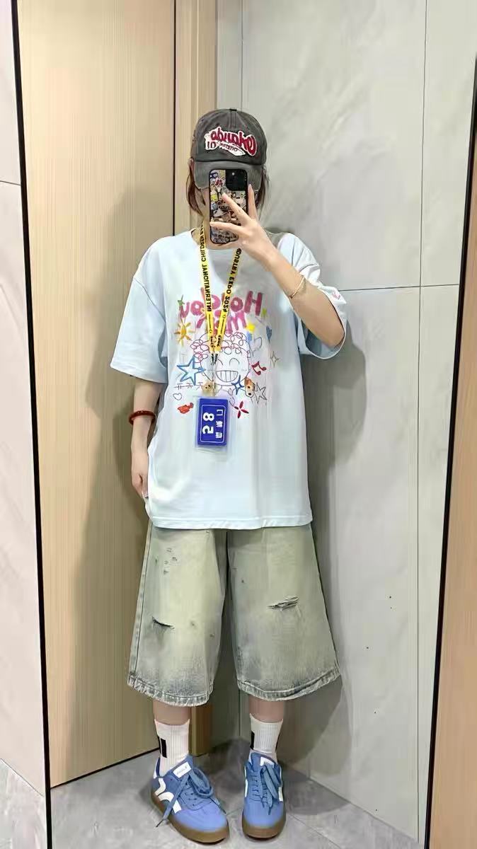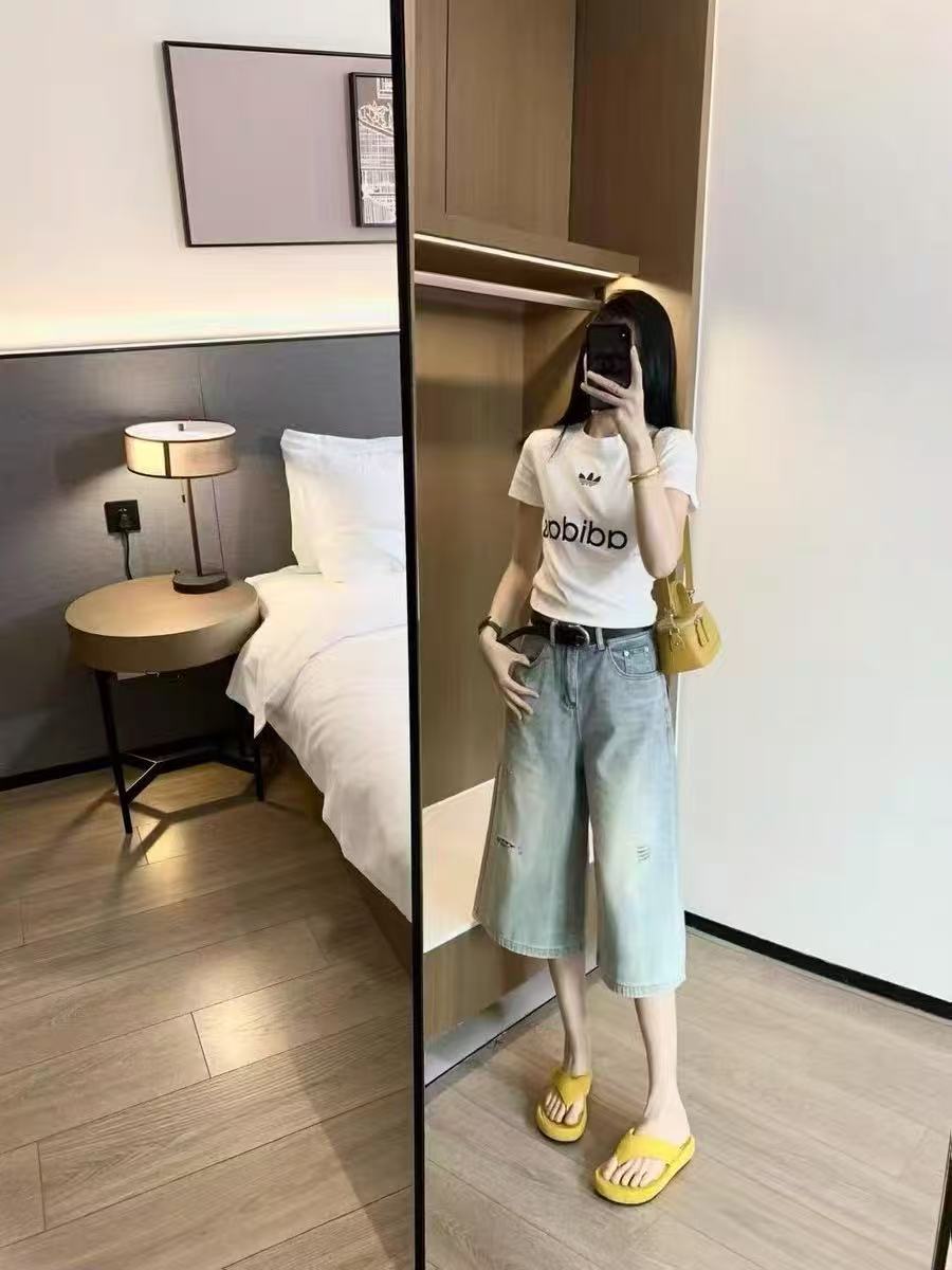 ワイドシルエットで脚長効果があり、夏のカジュアルコーデにぴったり。