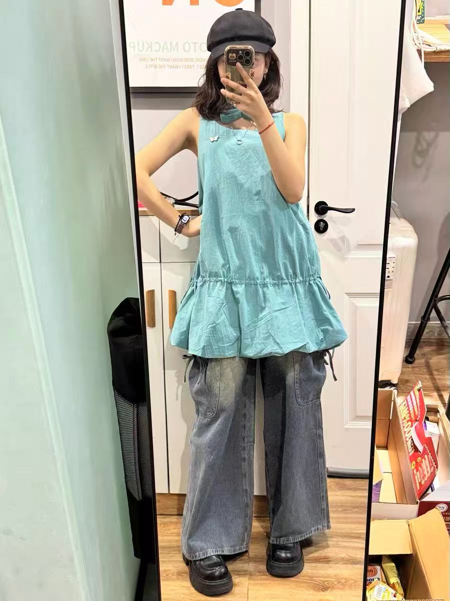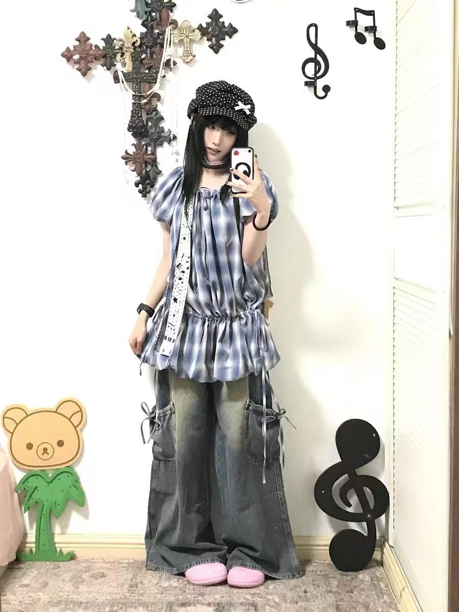 ハイウエスト リボン付き レディース デニムワイドパンツ