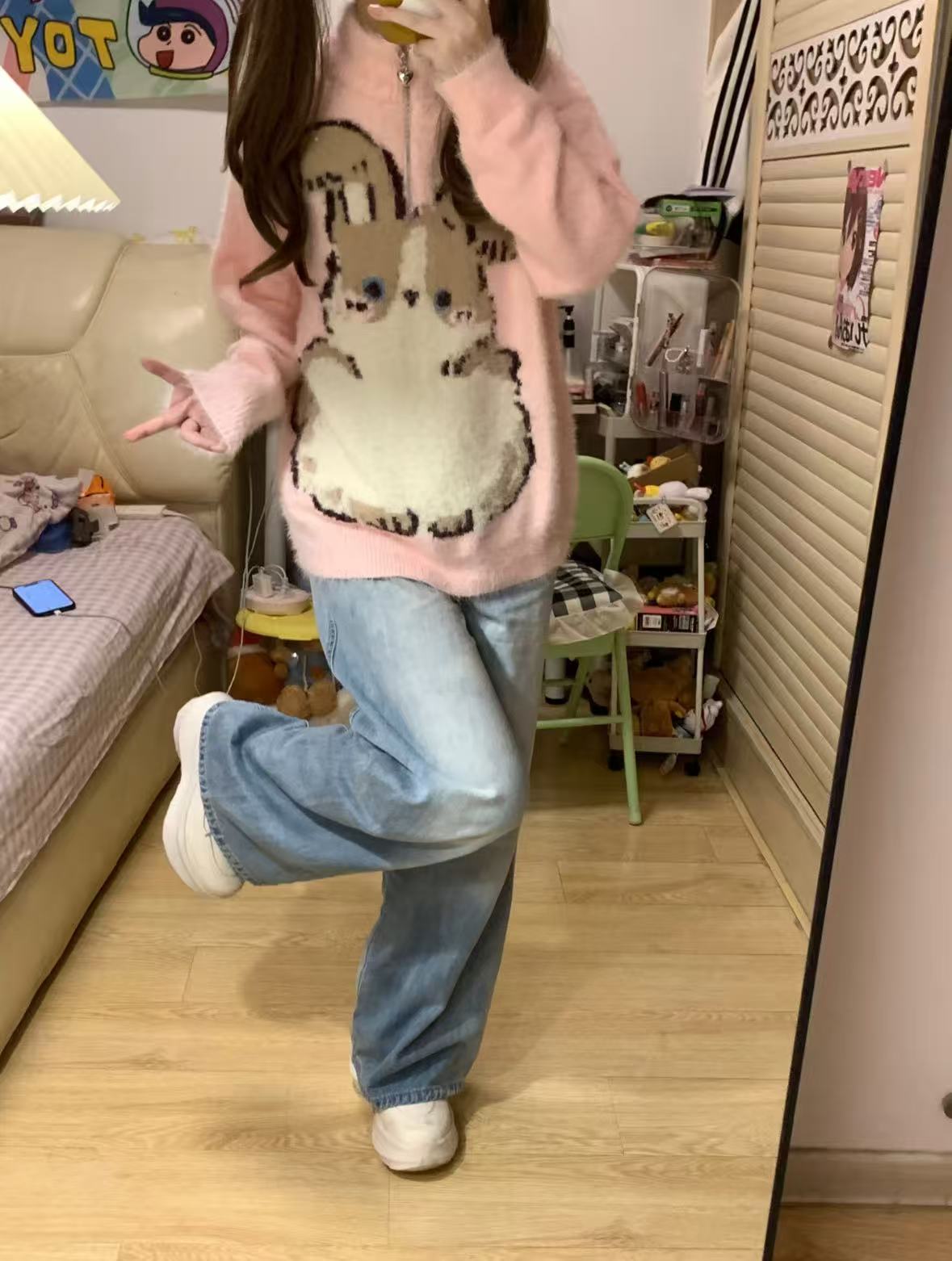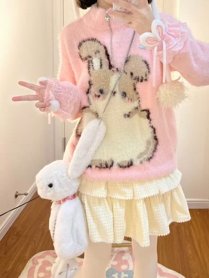 ハーフジップうさぎニットプルオーバー