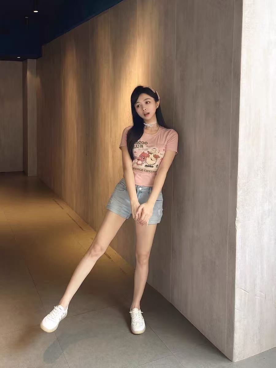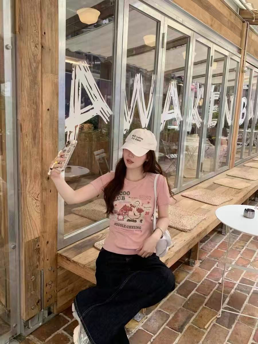 ガーリーなピンクカラーが可愛らしいショート丈Tシャツ。