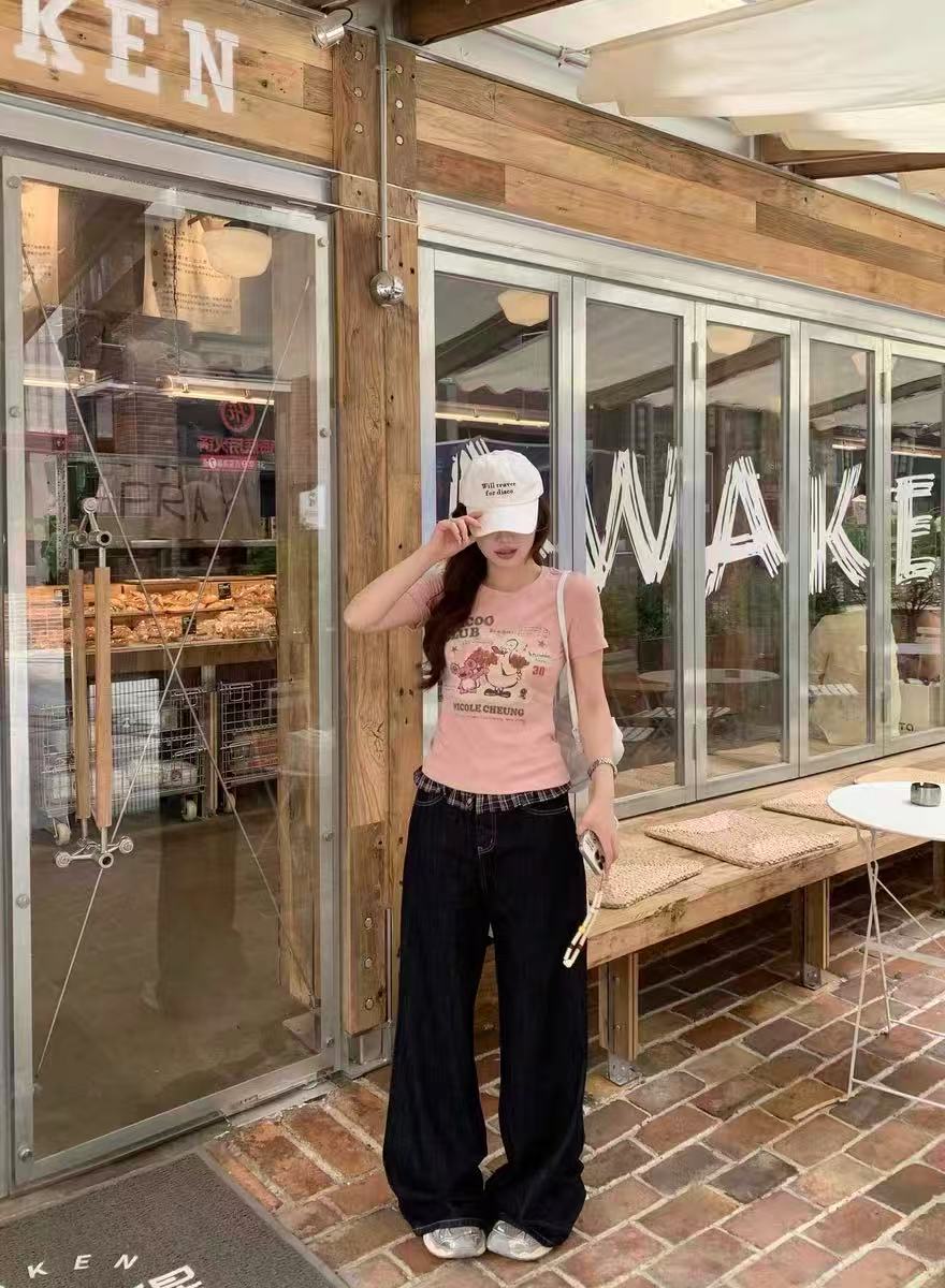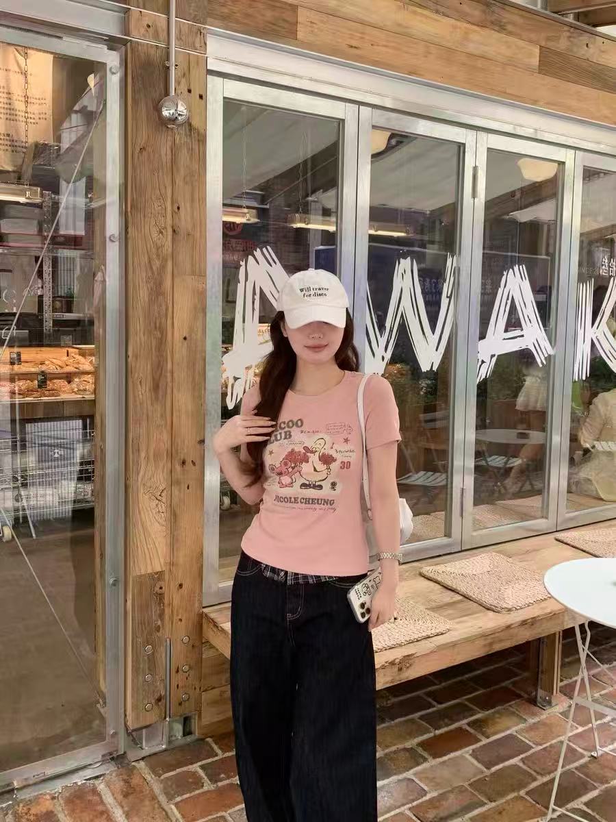 ピンク ジャストショルダー ショート丈Tシャツ