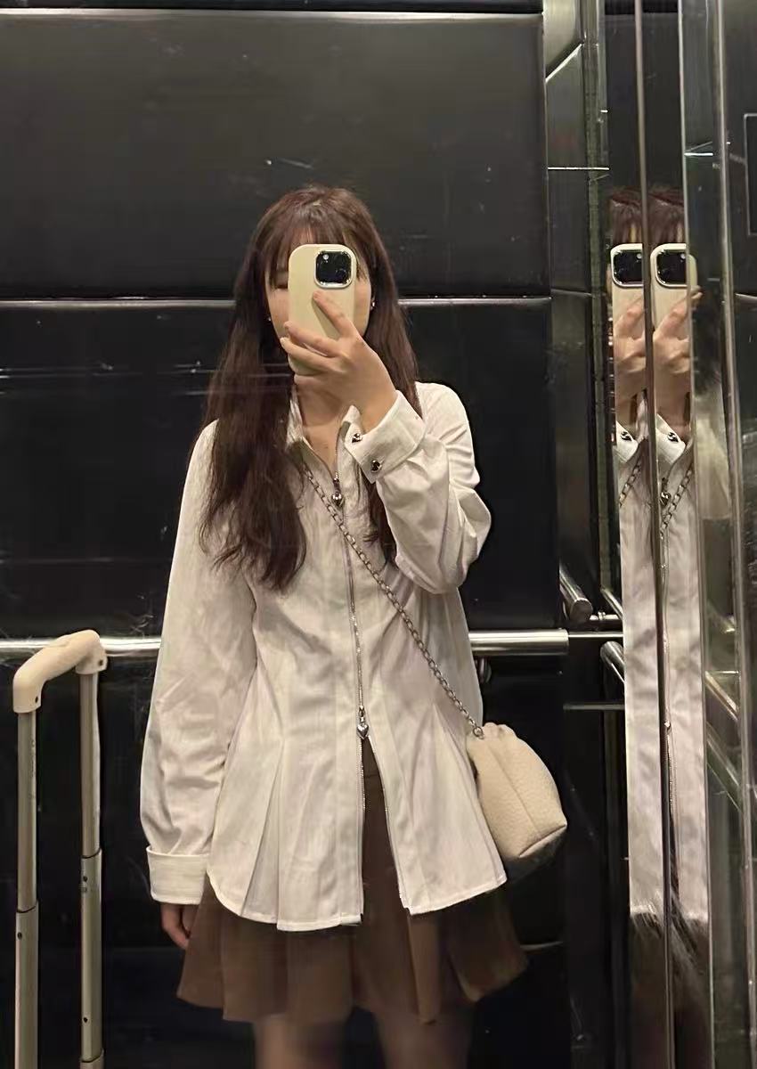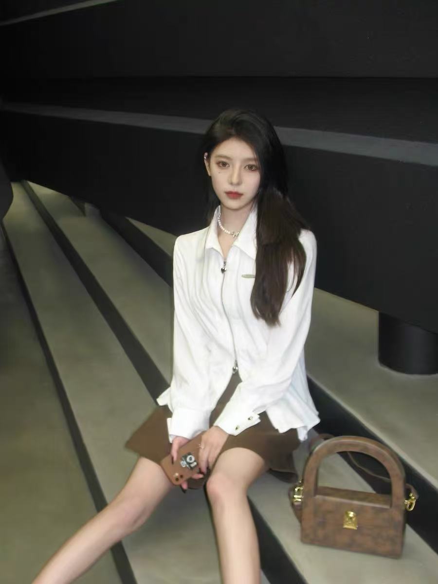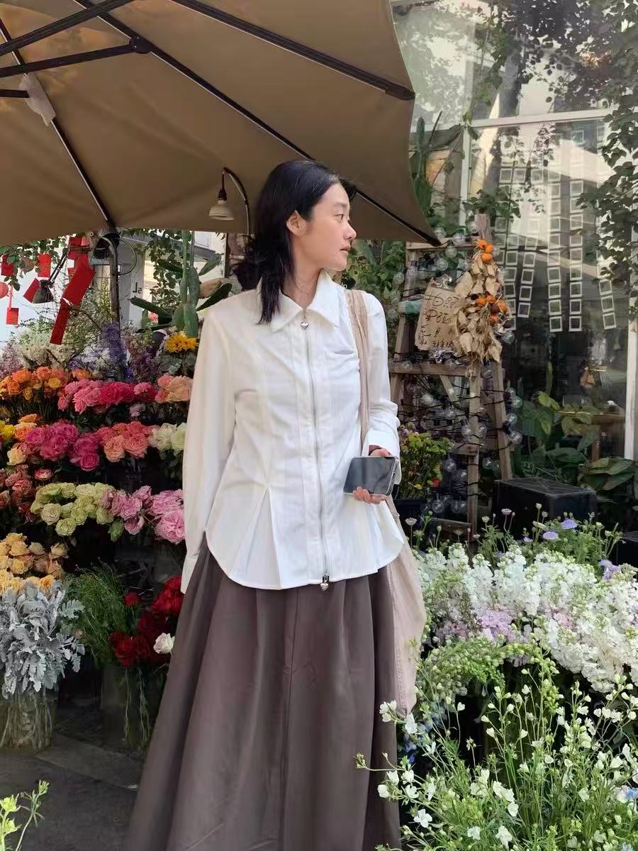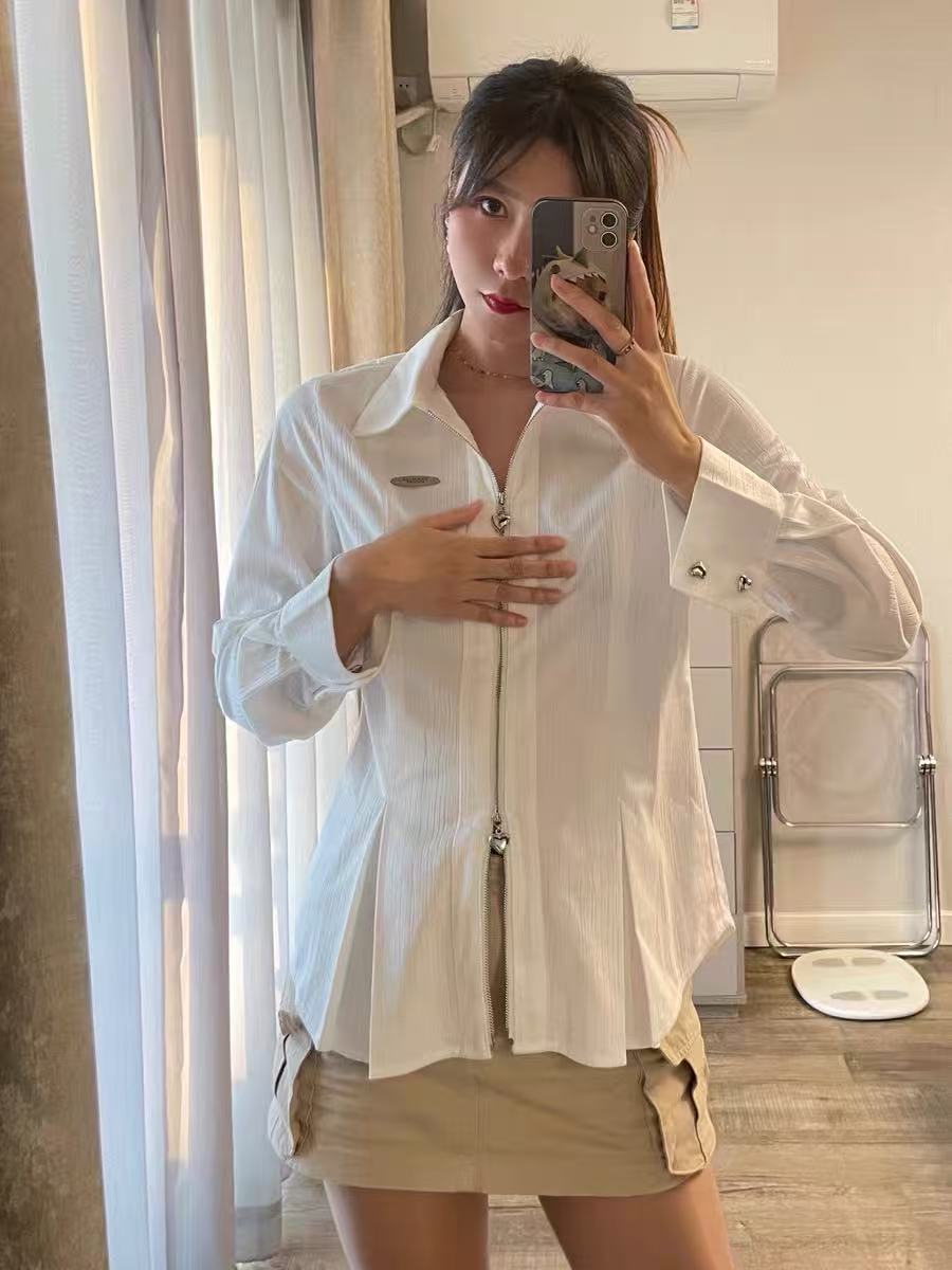 レトロ感漂うPOLO襟とダブルジップが印象的なホワイトの長袖シャツ。シンプルながらもデザイン性が高く、カジュアルからきれいめまで幅広いコーディネートに活躍します。フロントジップは上下から開閉でき、着こなしのアレンジも自在。デニムと合わせてヴィンテージ風に、またはスカートと合わせて大人カジュアルに仕上げるのもおすすめです。