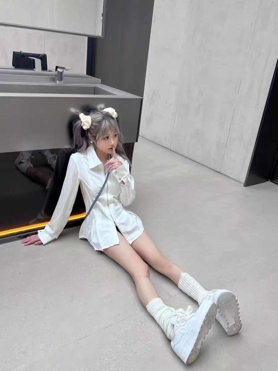 レトロPOLO襟 ダブルジップシャツ 長袖 ホワイト