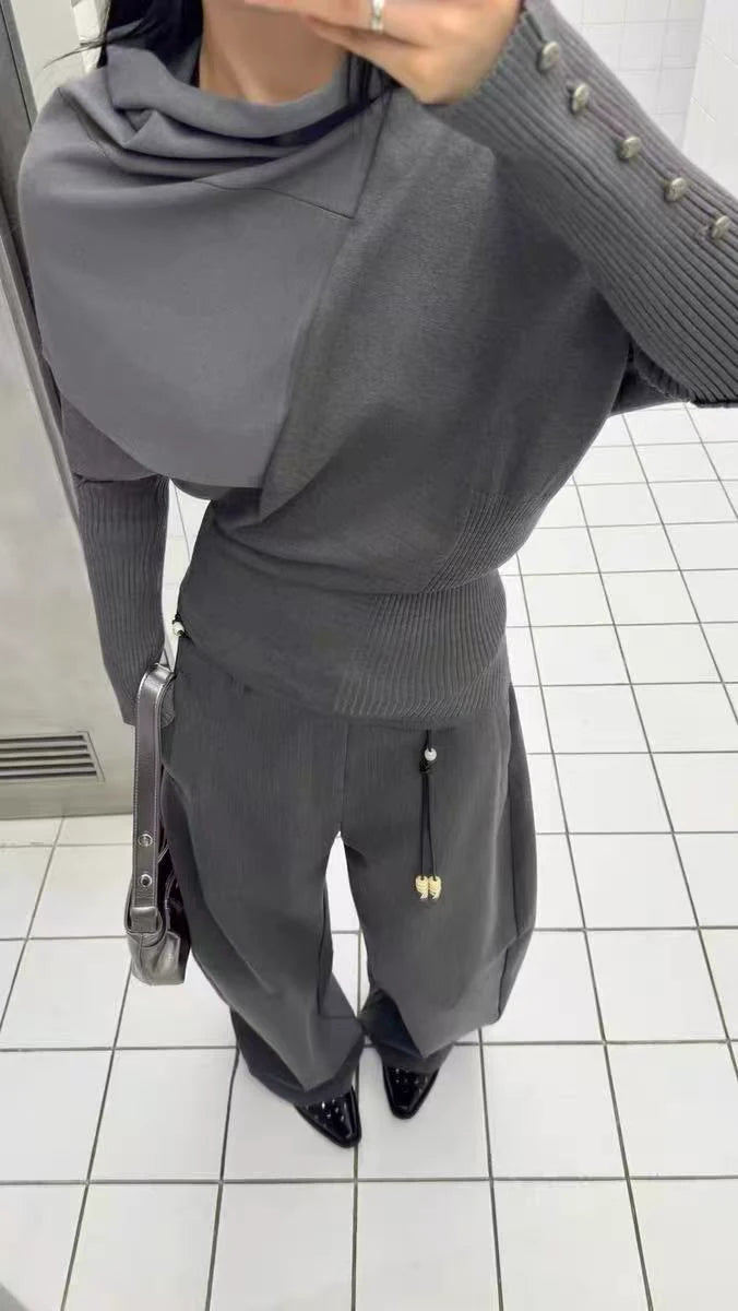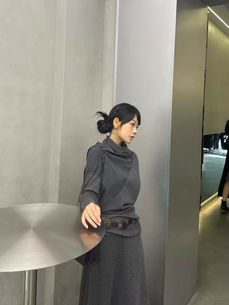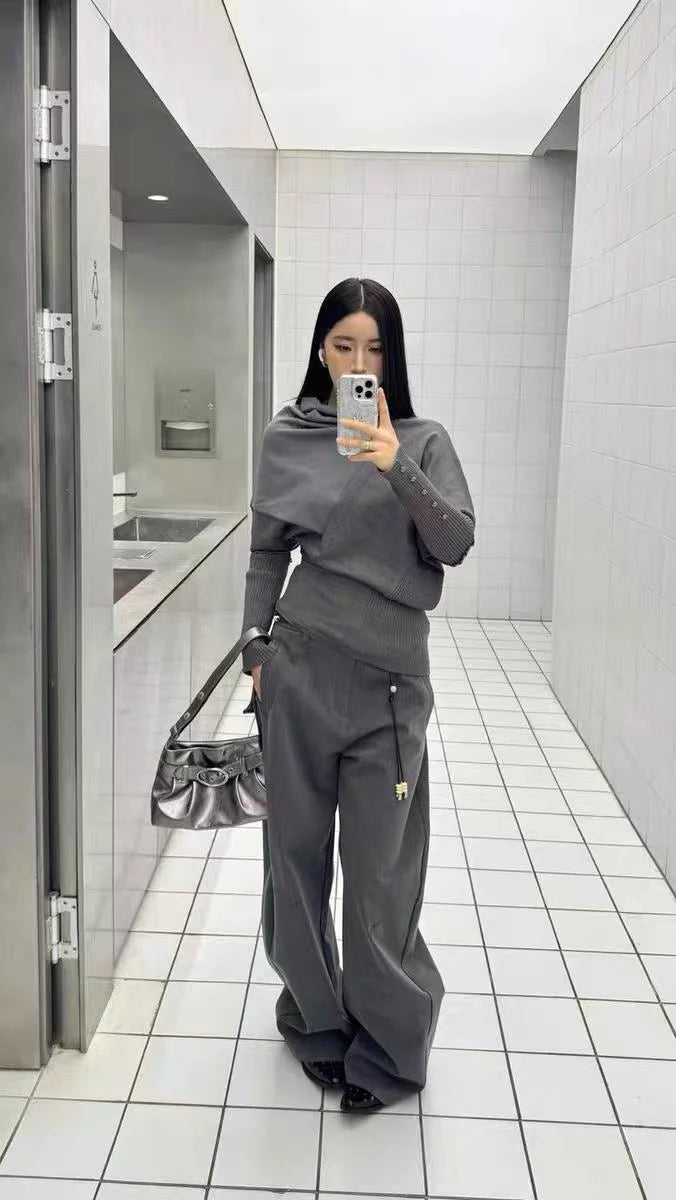 アシンメトリーなネックラインが印象的な、デザインニットトップス。