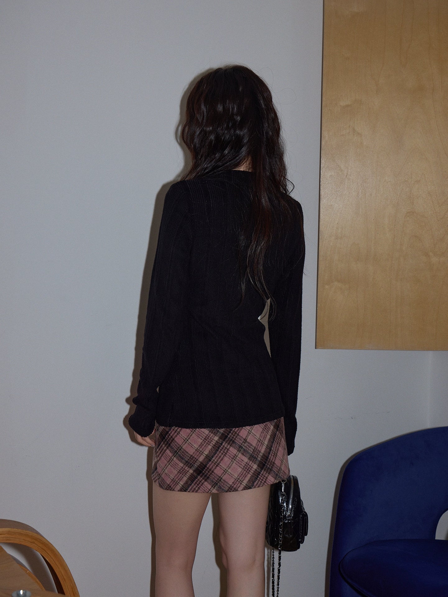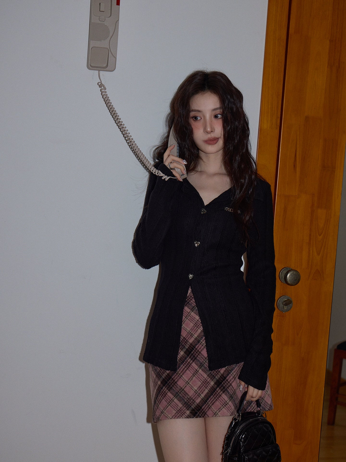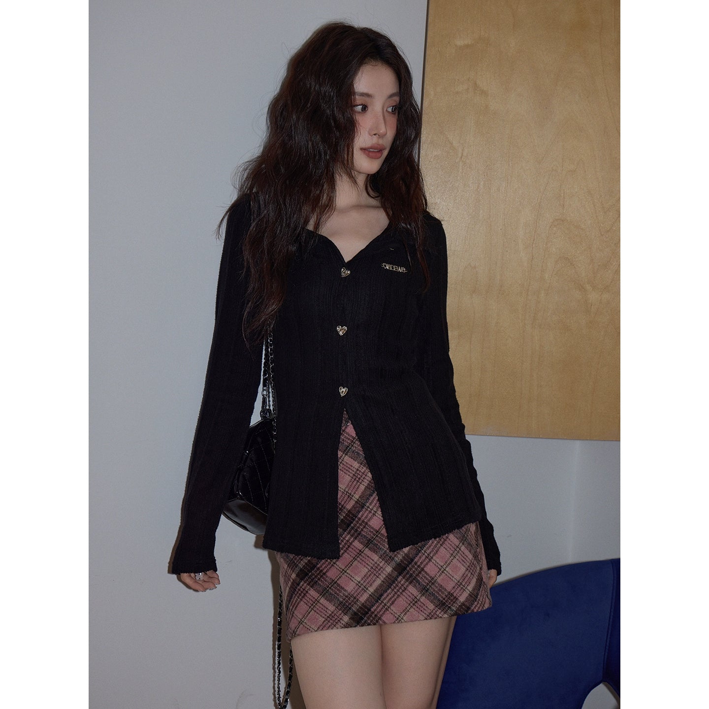 ポロ襟デザインとハートボタンがアクセントの長袖リブニットトップス。
