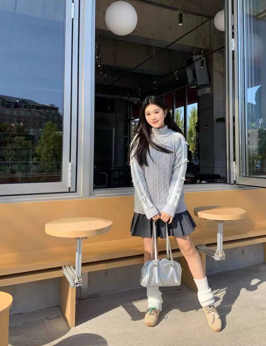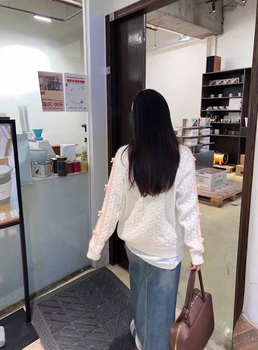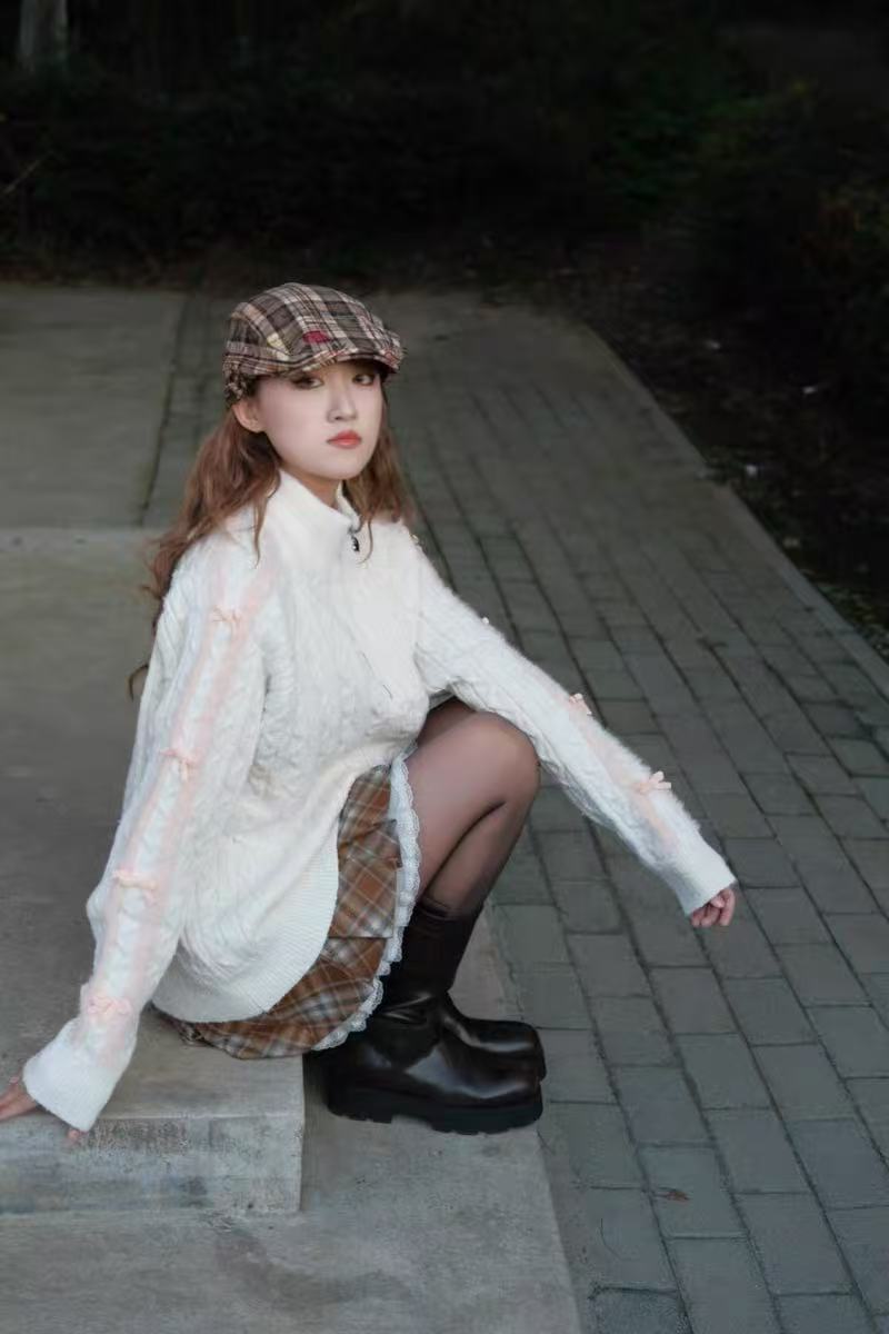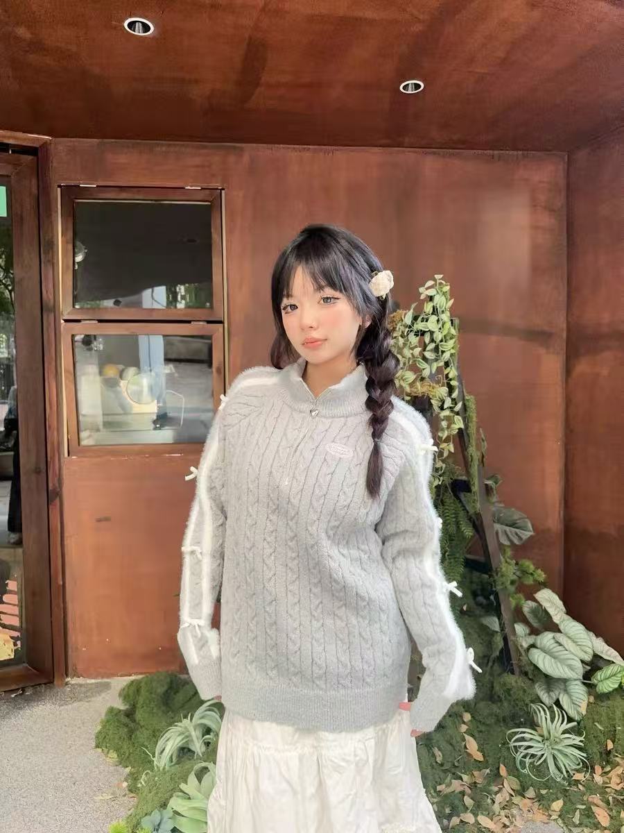 袖口のリボンディテールがフェミニンな印象を添えるニットトップス。