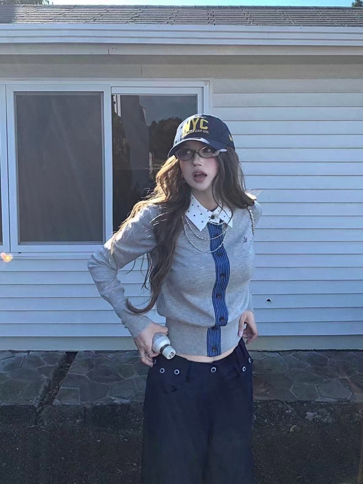 コントラストカラーと刺繍デザインが目を惹くレディースニットカーディガン。