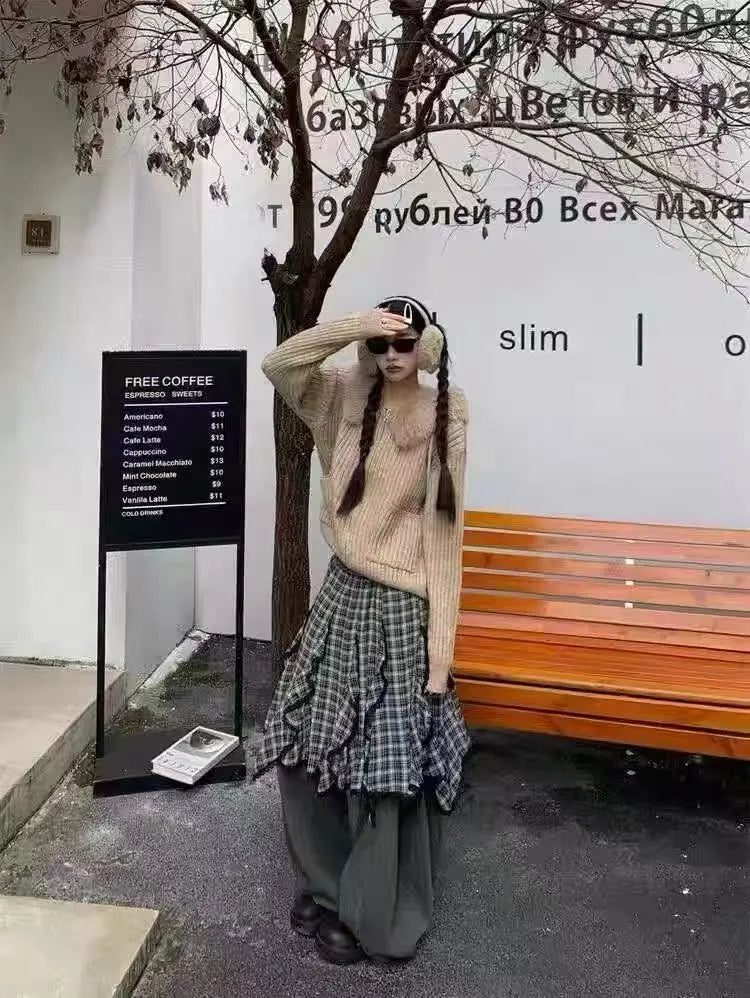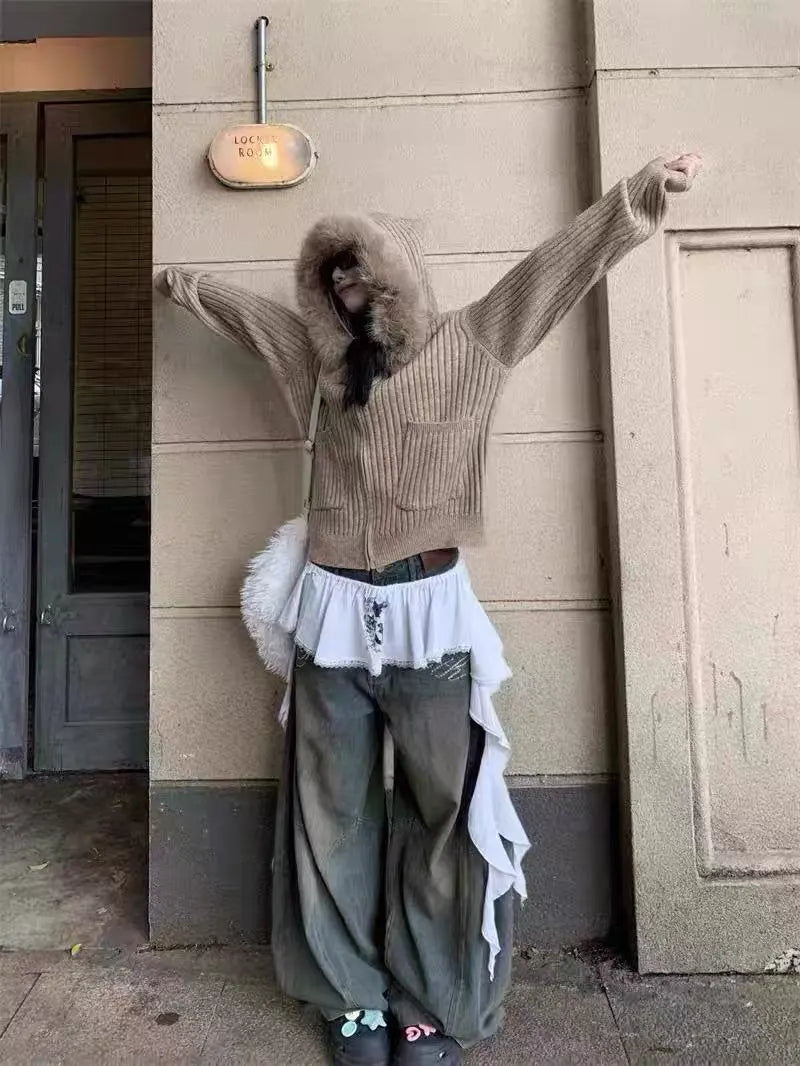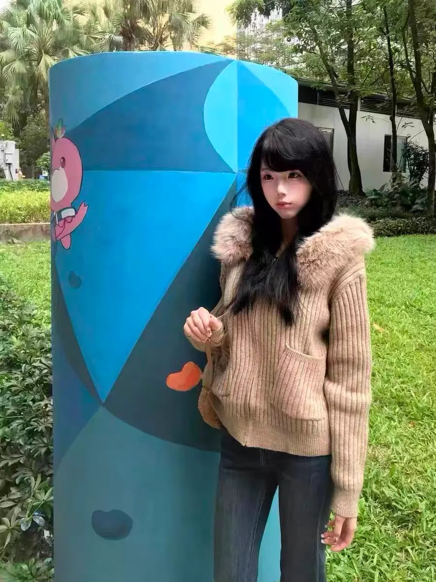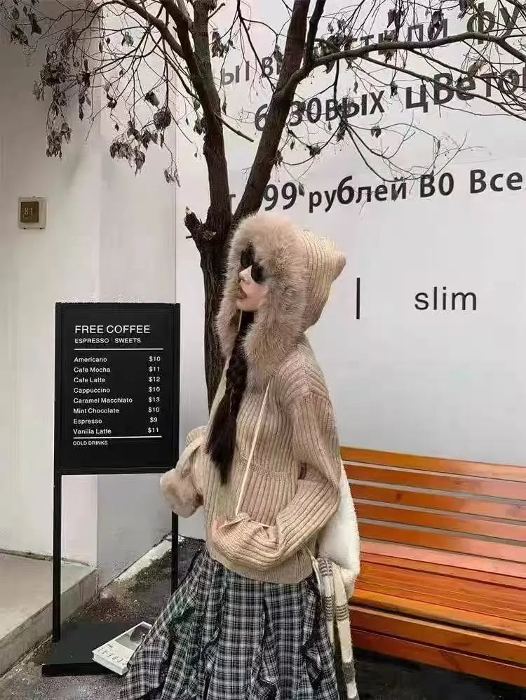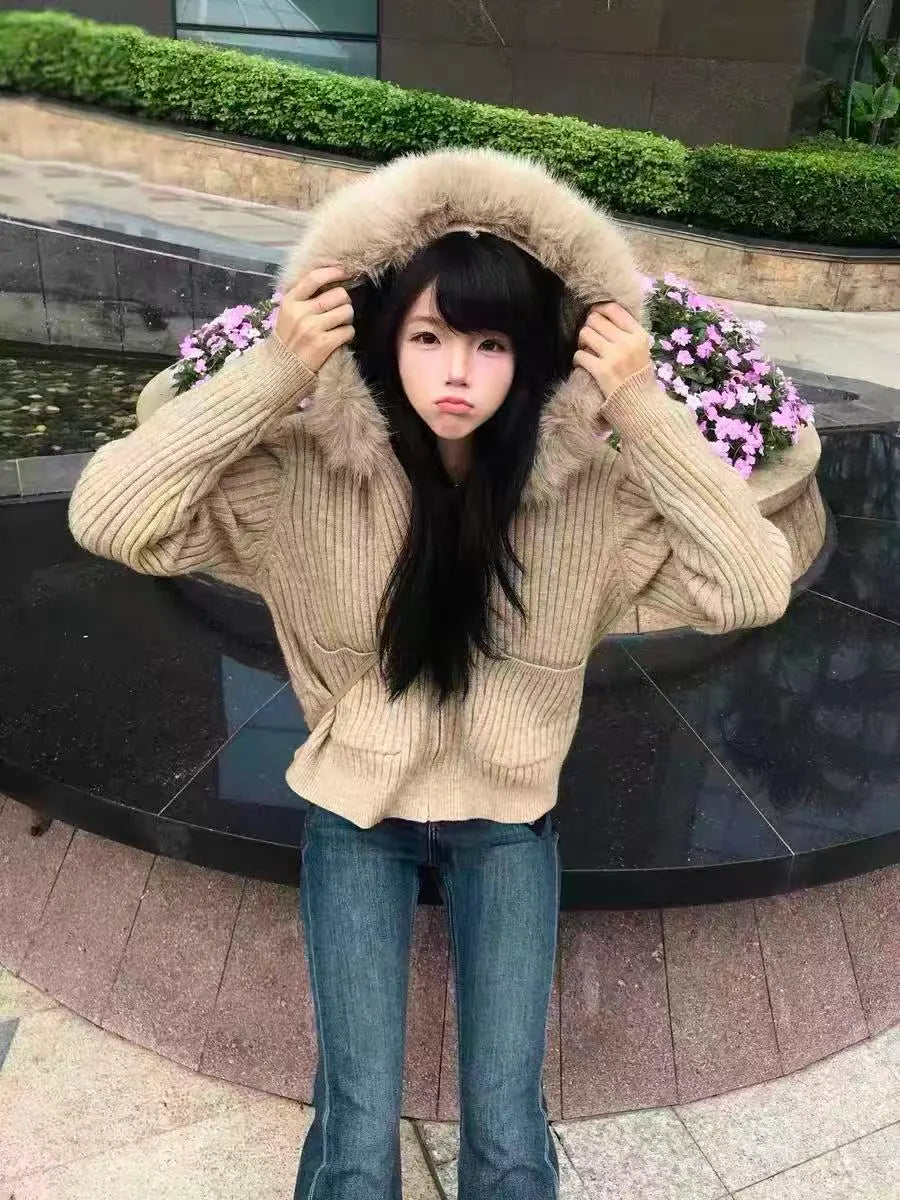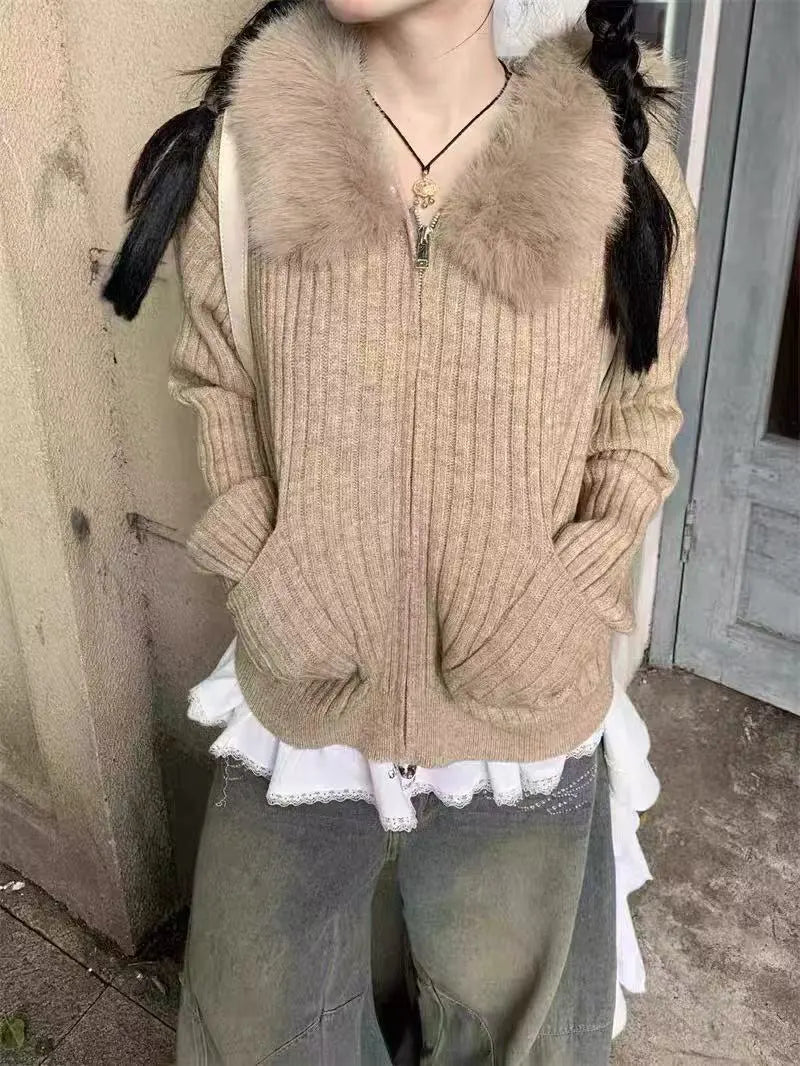 取り外し可能なファーカラーが印象的な、ショート丈ニットカーディガン。