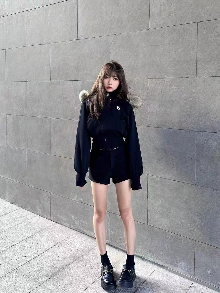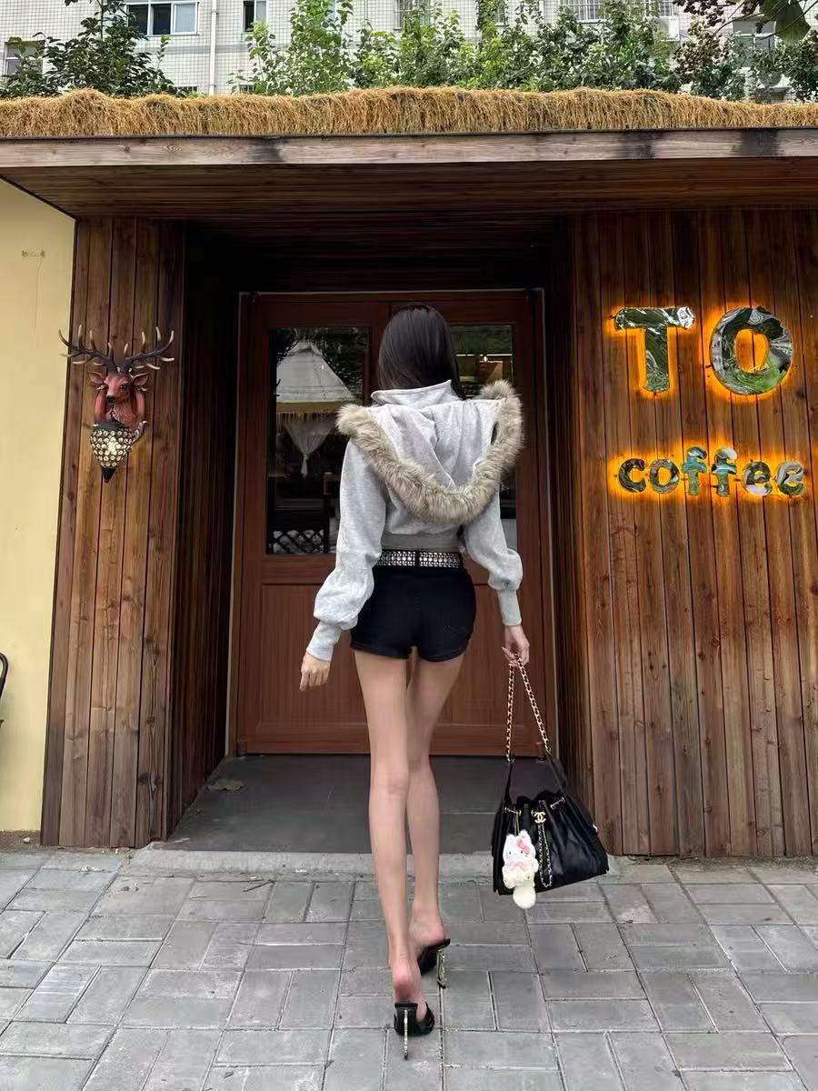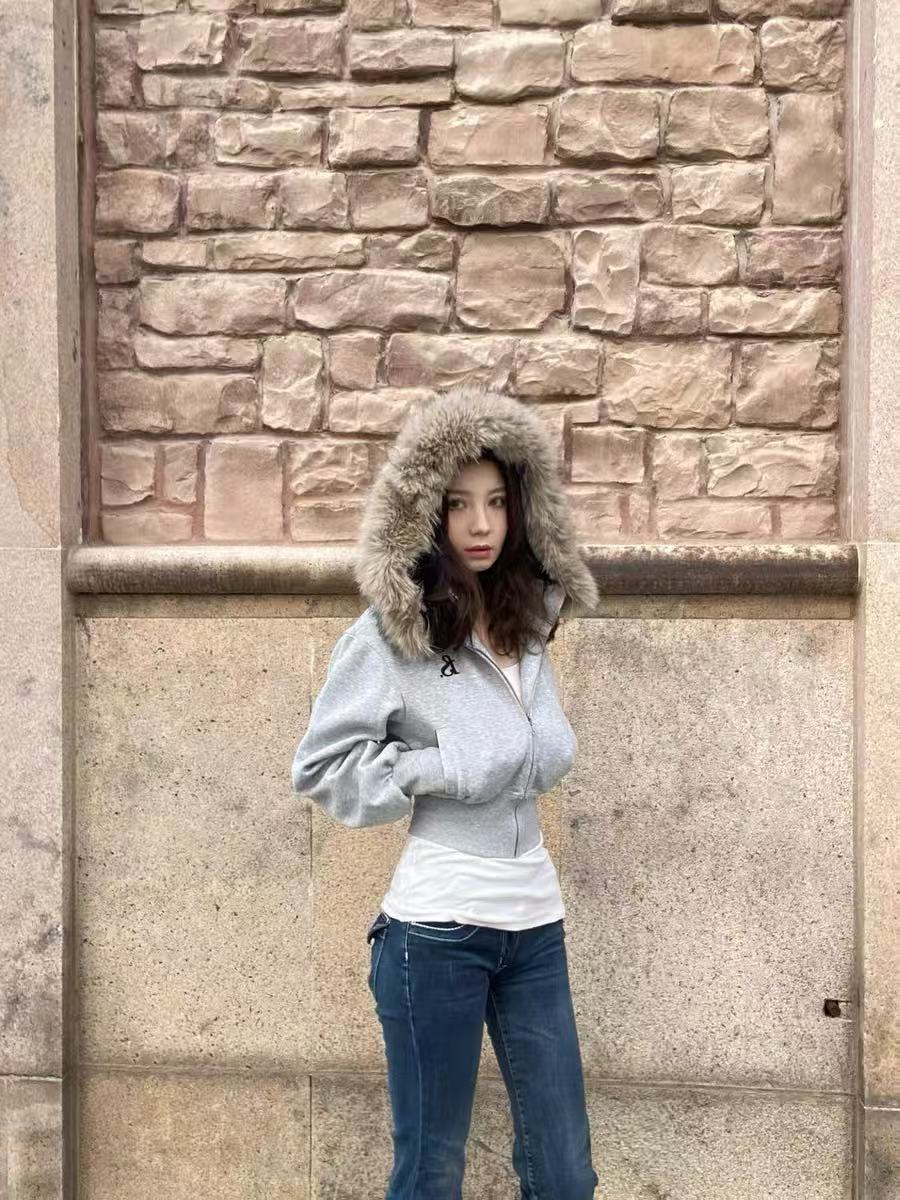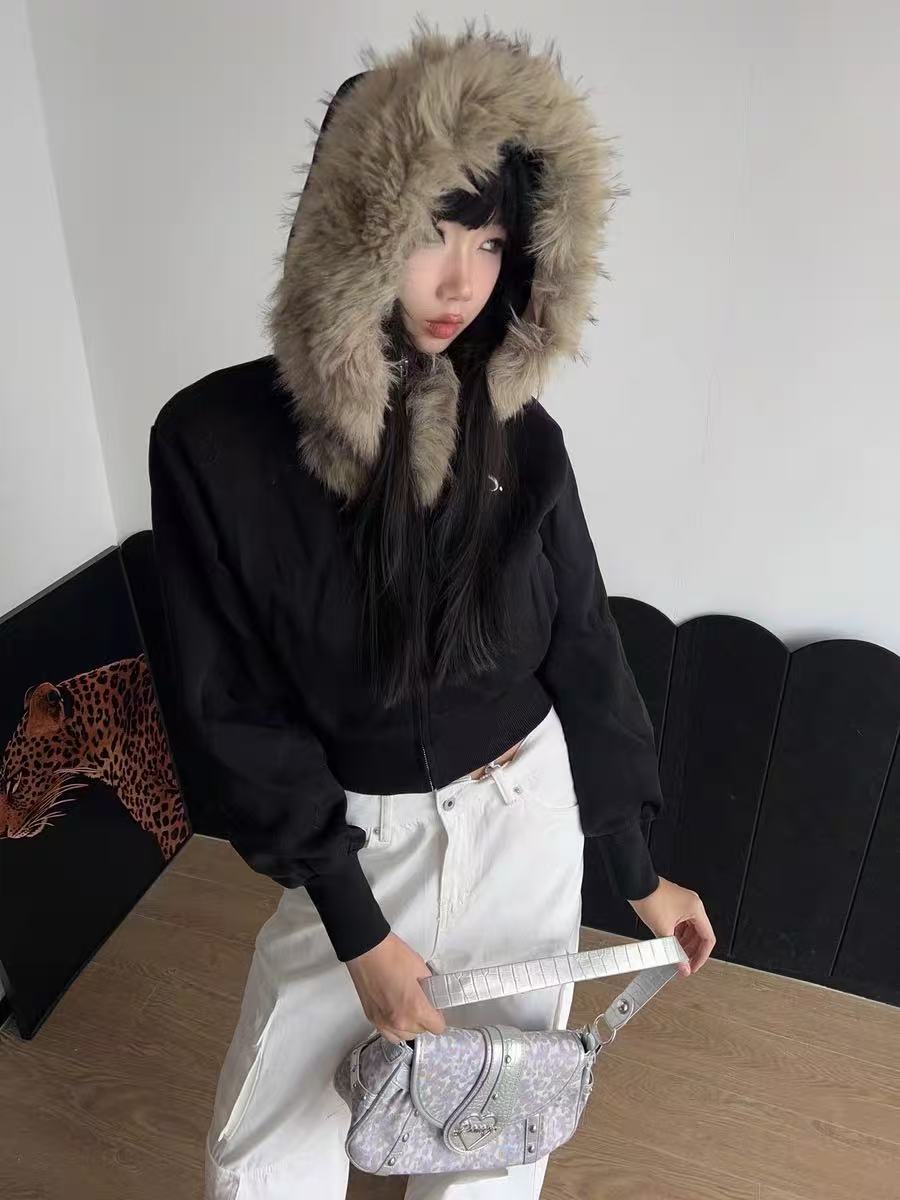 ボリューム感のあるファーフードがポイントのショートジップパーカー。