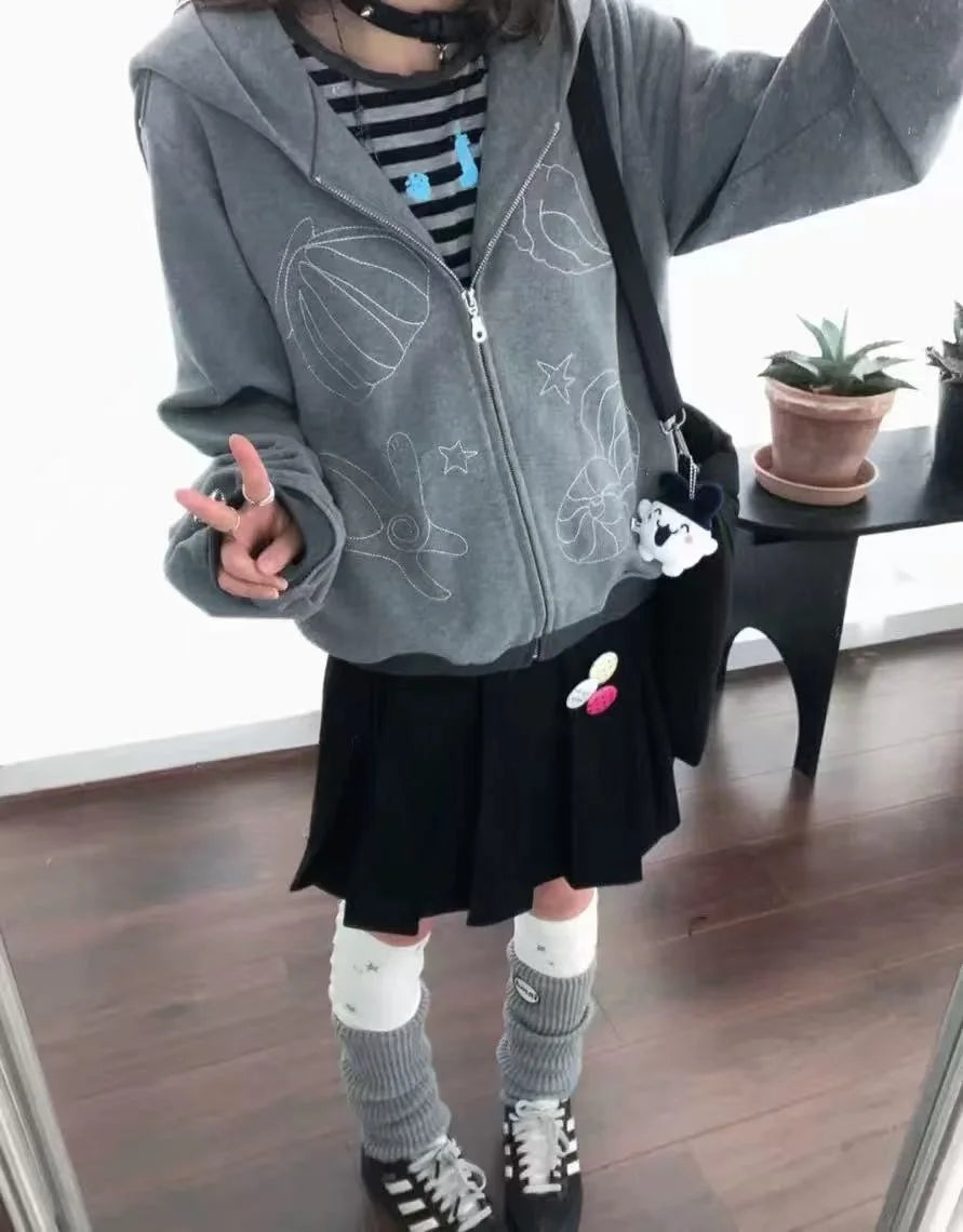 さりげない刺繍ディテールが印象的な、ミニマルデザインのフード付きジップカーディガン。