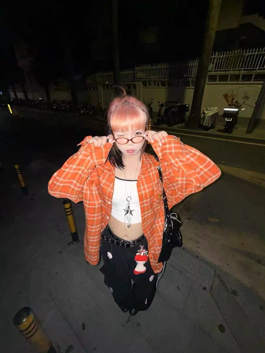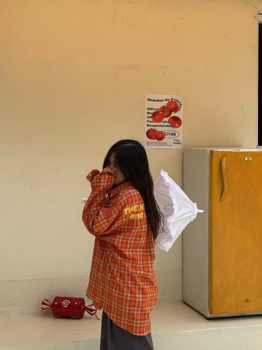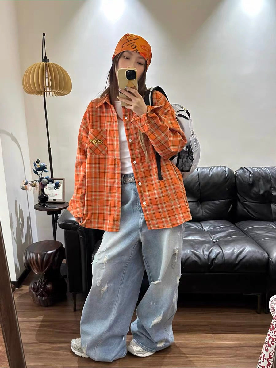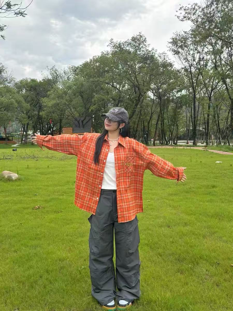 鮮やかなオレンジチェック柄が印象的なシャツジャケット。ゆったりとしたオーバーサイズシルエットで、リラックス感のあるカジュアルコーデやストリートファッションにマッチします。軽やかな素材で羽織りとしても着られ、秋のお出かけやデイリーコーデのアクセントに最適。韓国風コーデや古着風スタイルにも合わせやすい万能アイテムです。