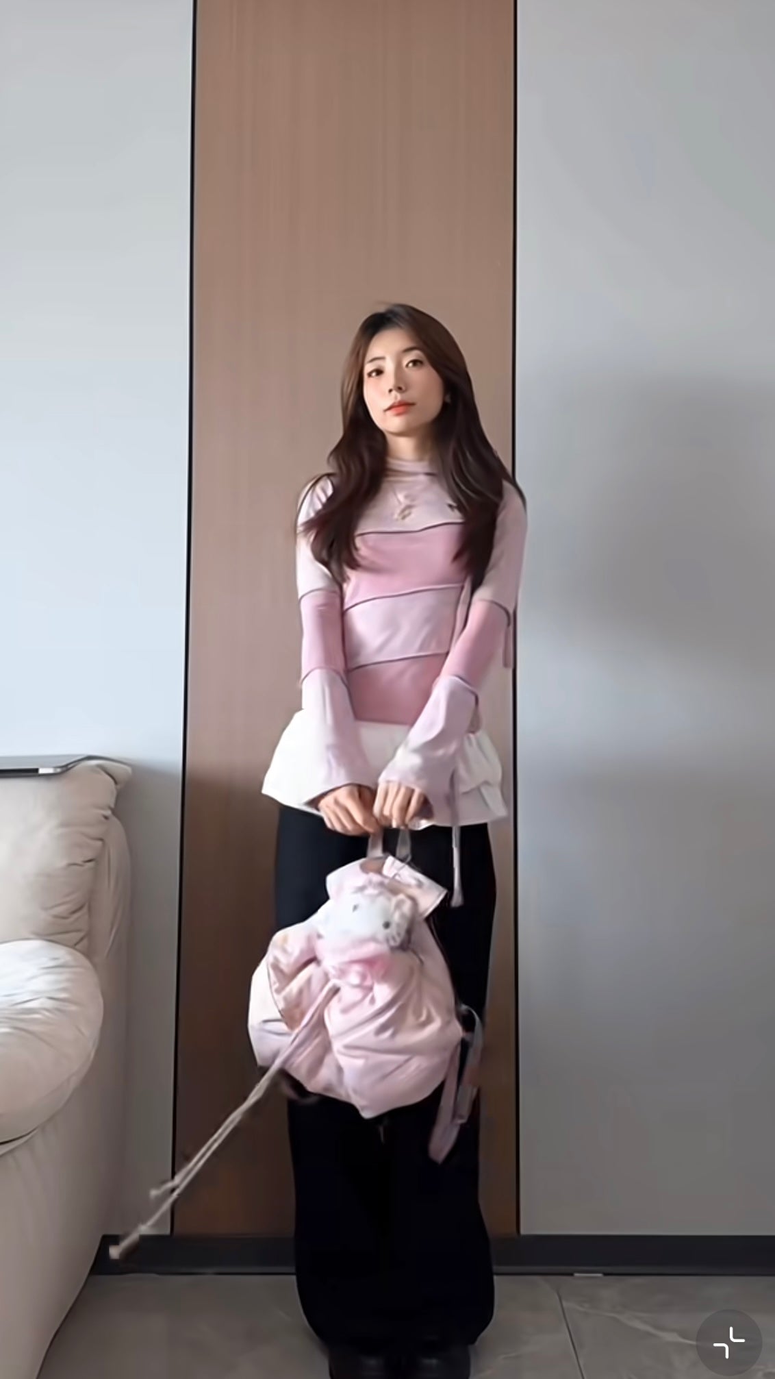 首元を飾るチョーカー風ストラップと、胸元の斜め切り替えデザインが視線を集めるピンクの長袖ニットトップス。