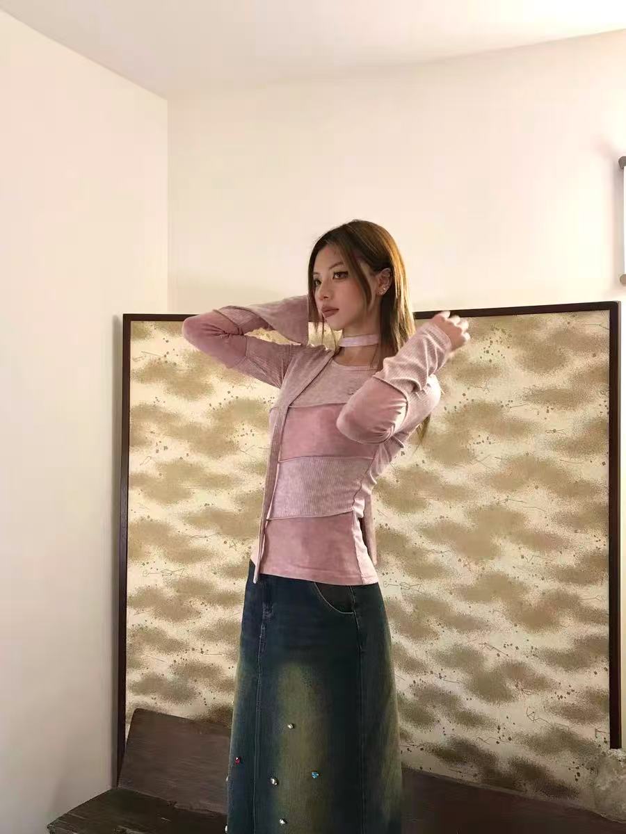 首元を飾るチョーカー風ストラップと、胸元の斜め切り替えデザインが視線を集めるピンクの長袖ニットトップス。