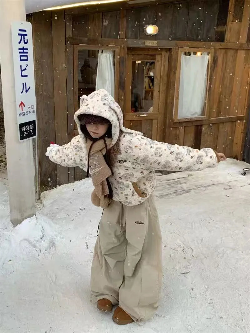 Star Print Cat Ear Padded Jacket with Removable Fur Collar OL2057