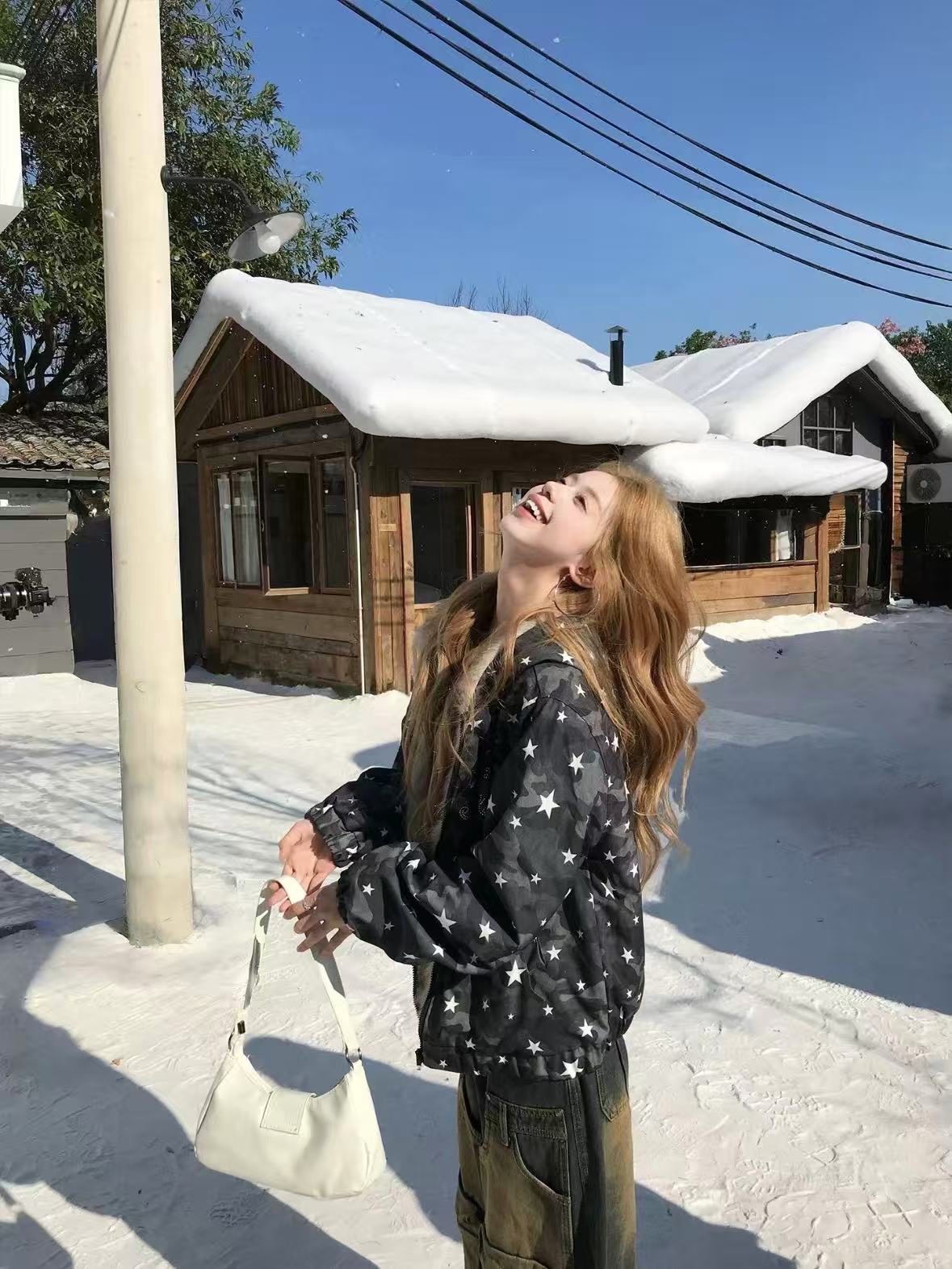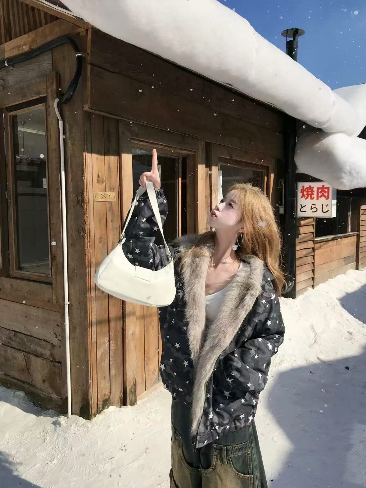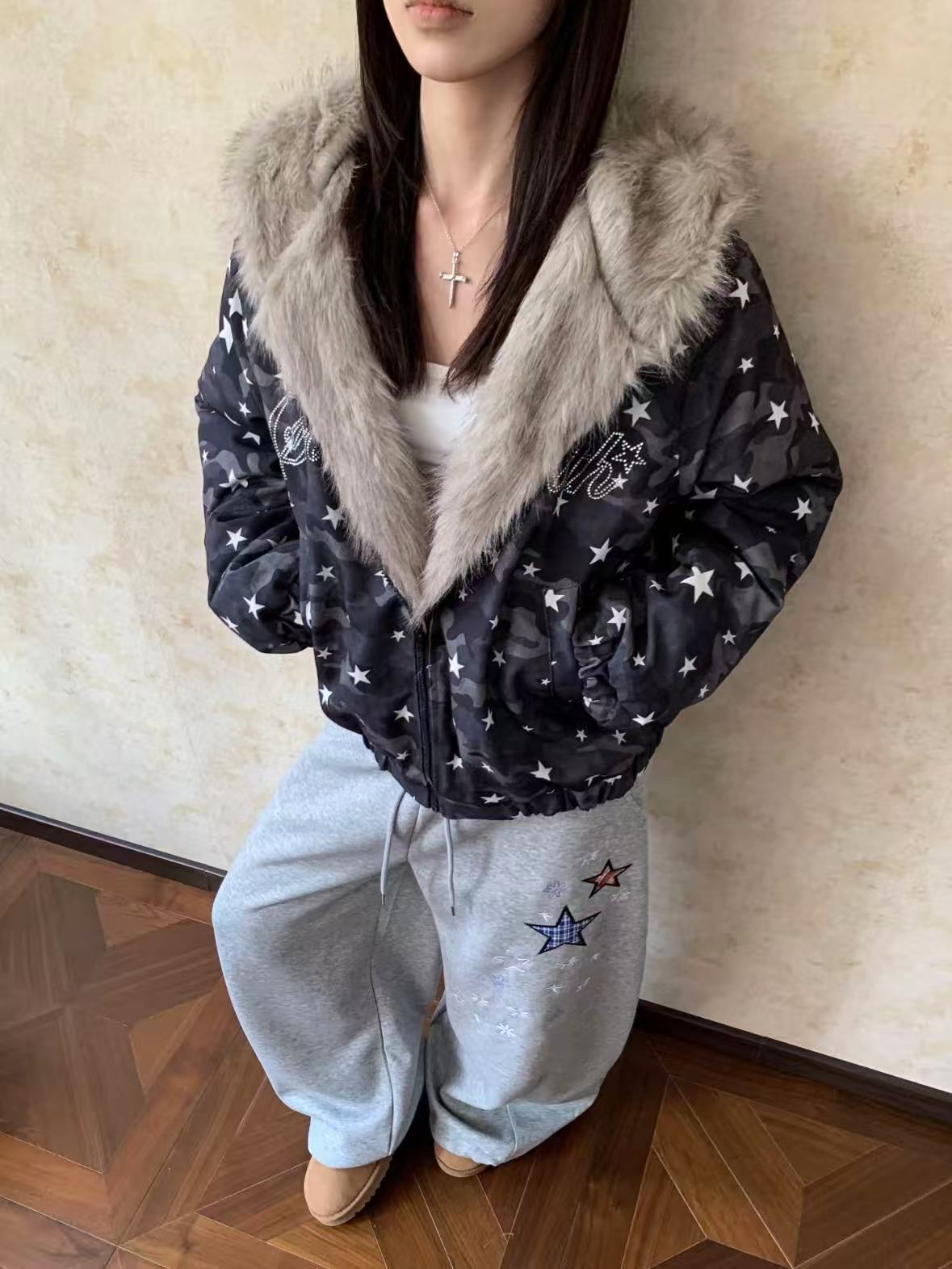 Rhinestone Star Camo Hooded Padded Jacket OL2045