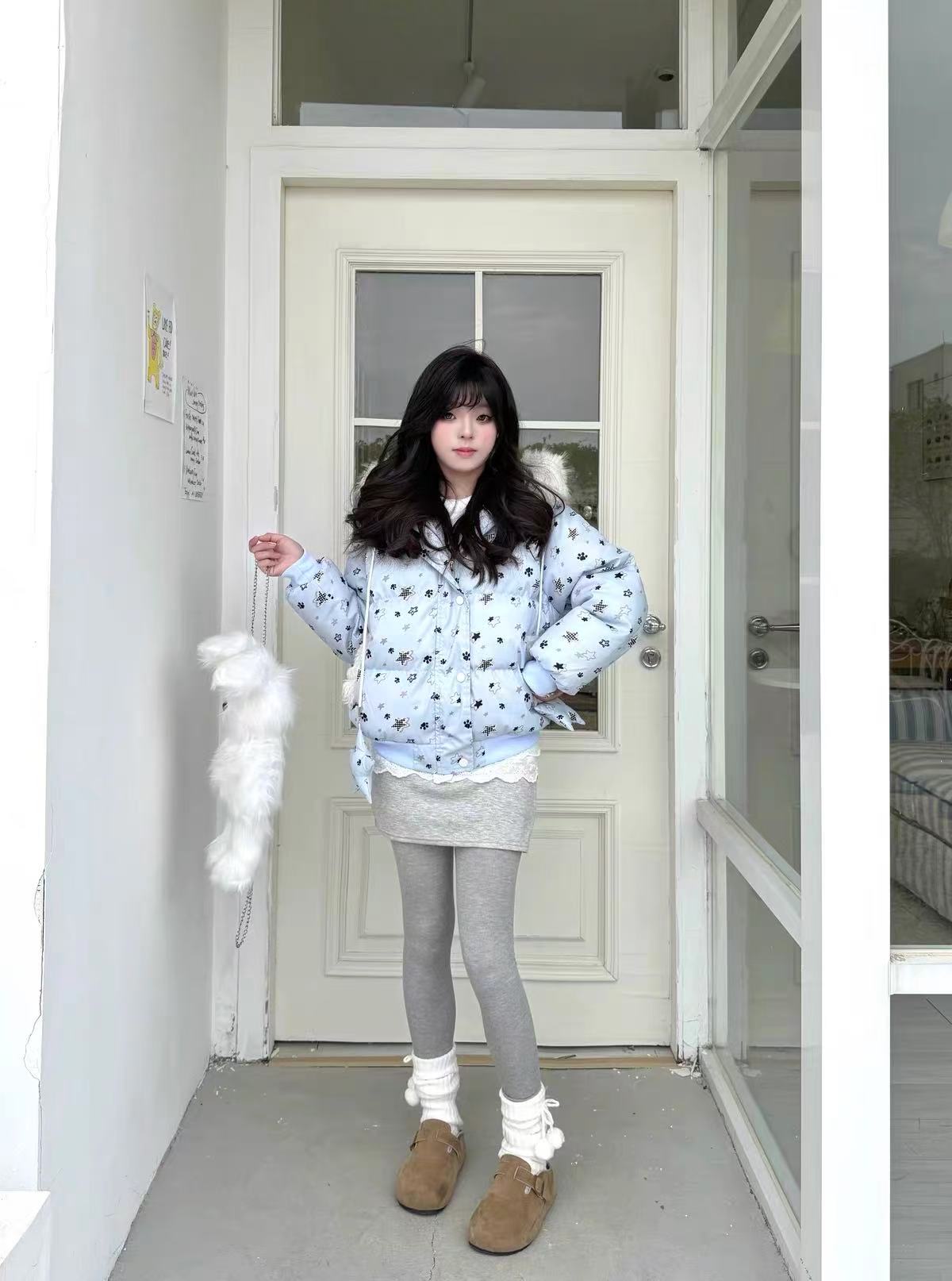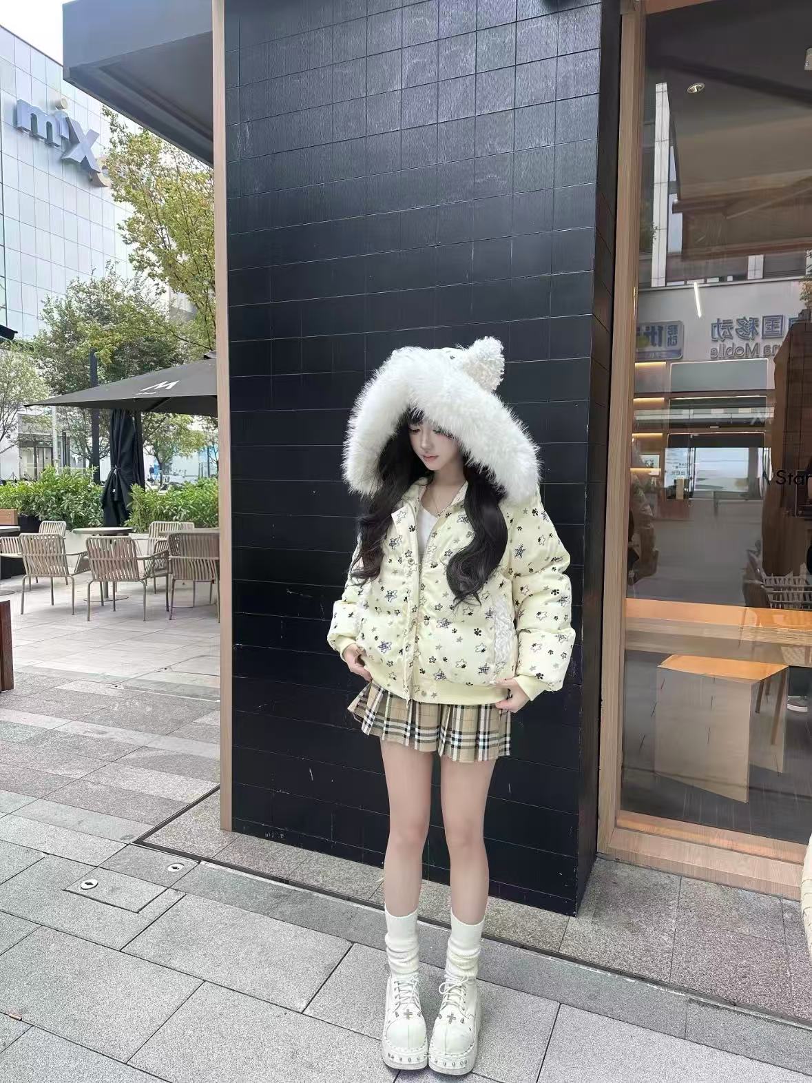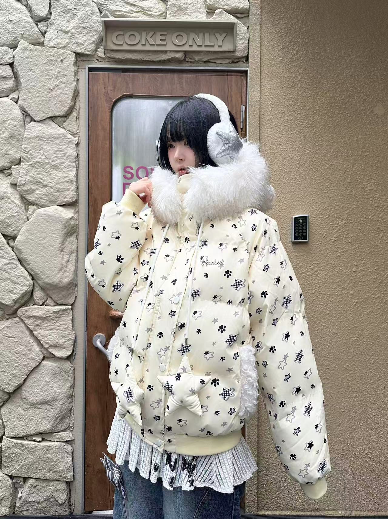 Star Print Cat Ear Padded Jacket with Removable Fur Collar OL2057