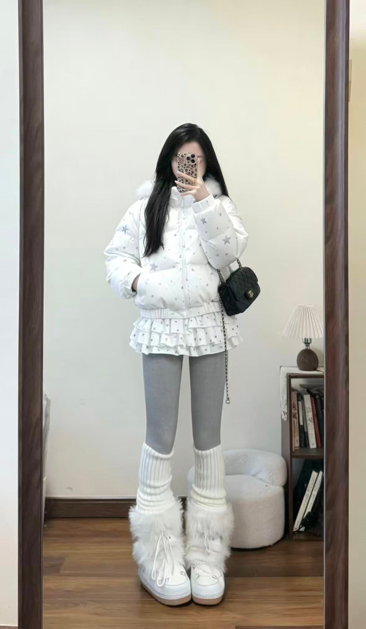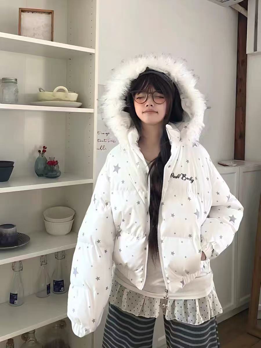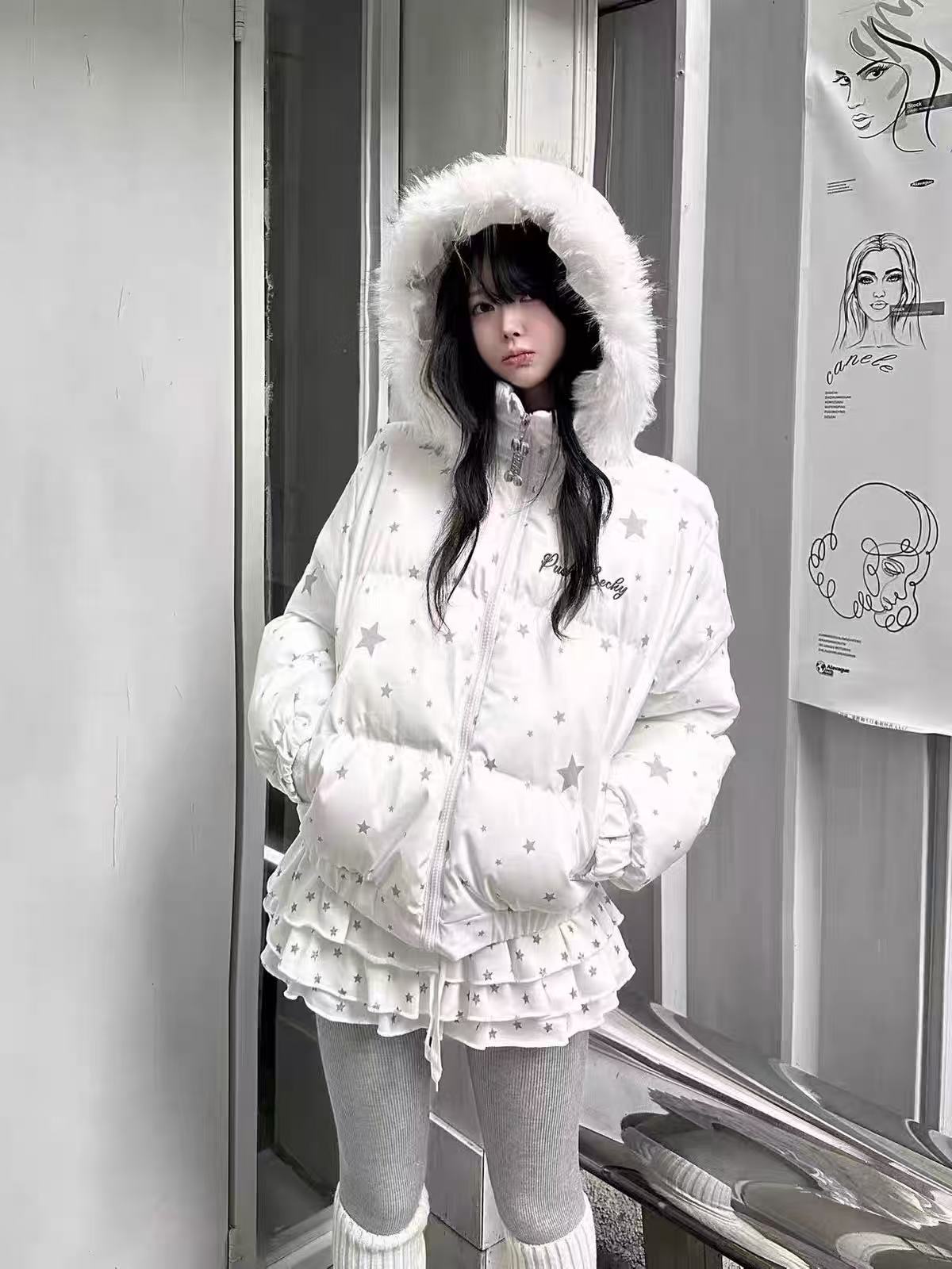 Star Print Faux Fur Hooded Puffer Jacket OL2029