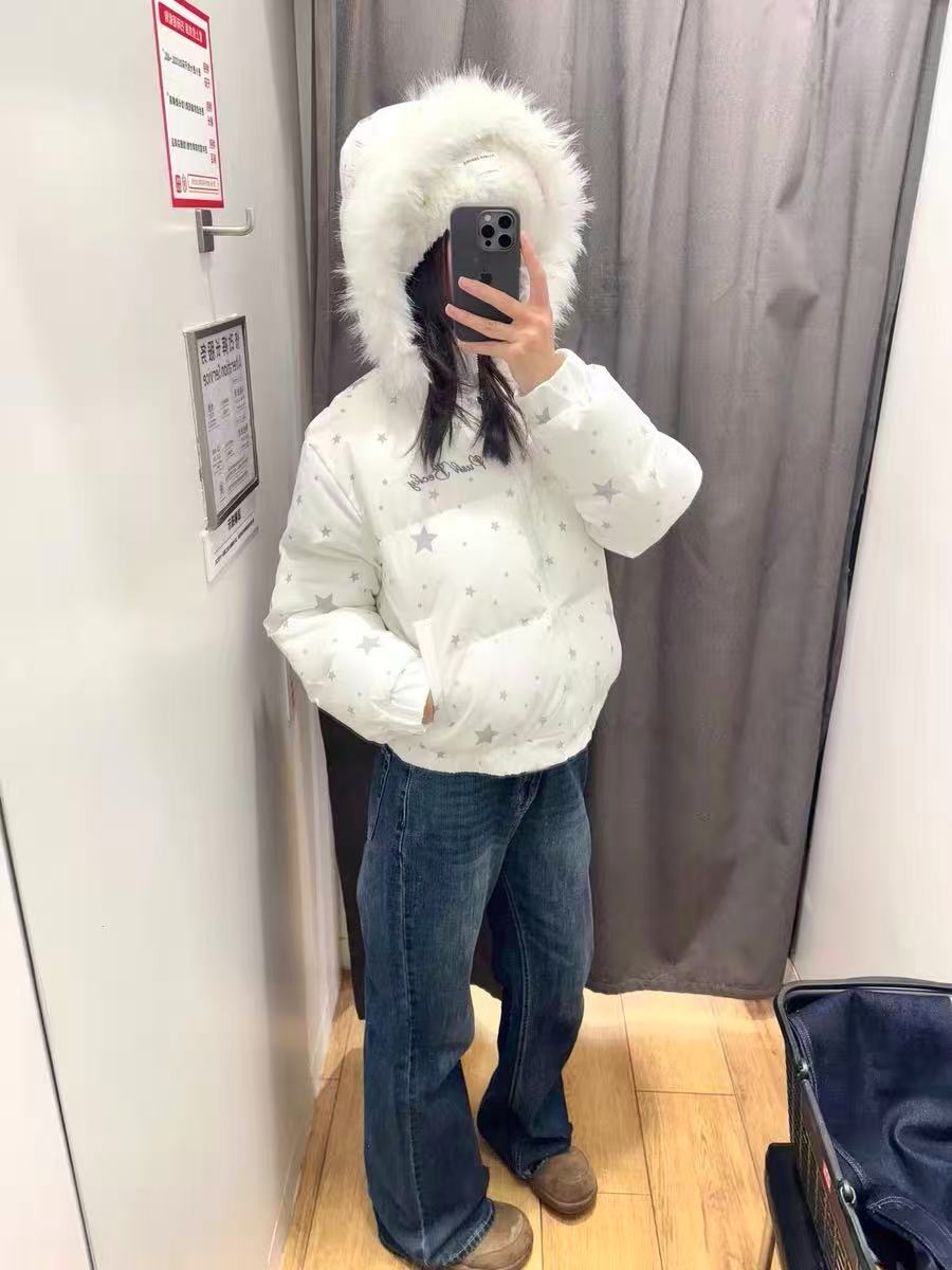 星柄を全面にあしらった遊び心のあるデザインが魅力のフード付きパファージャケット。