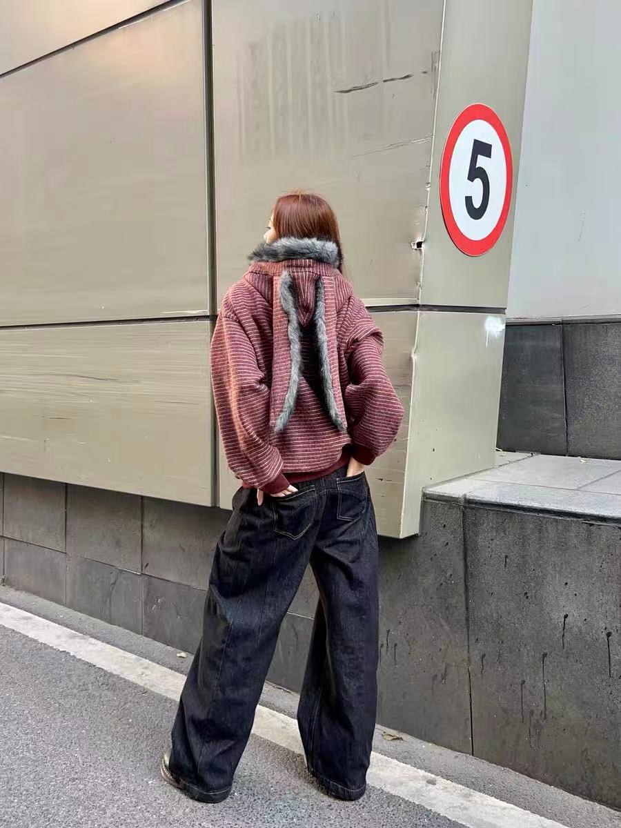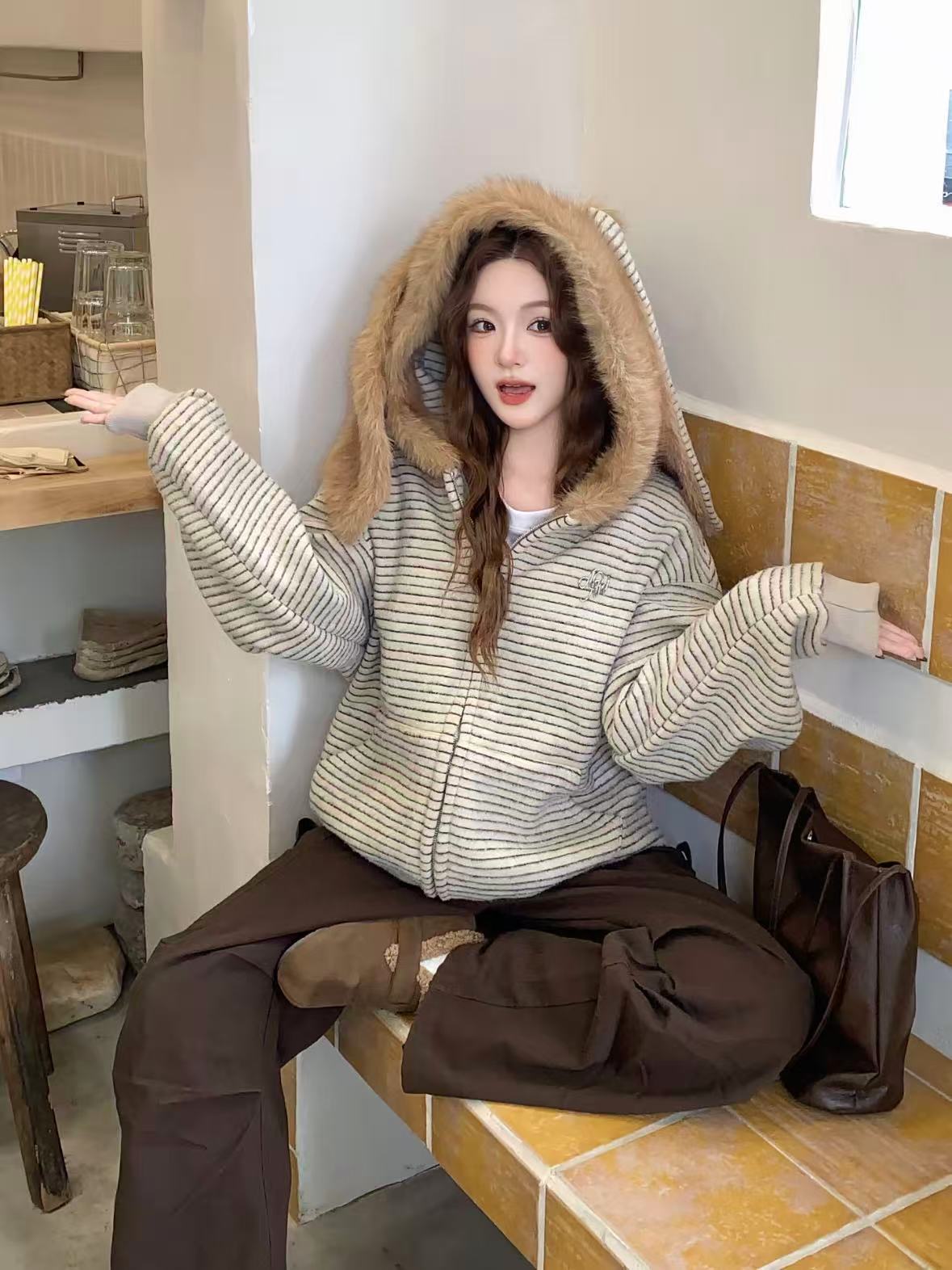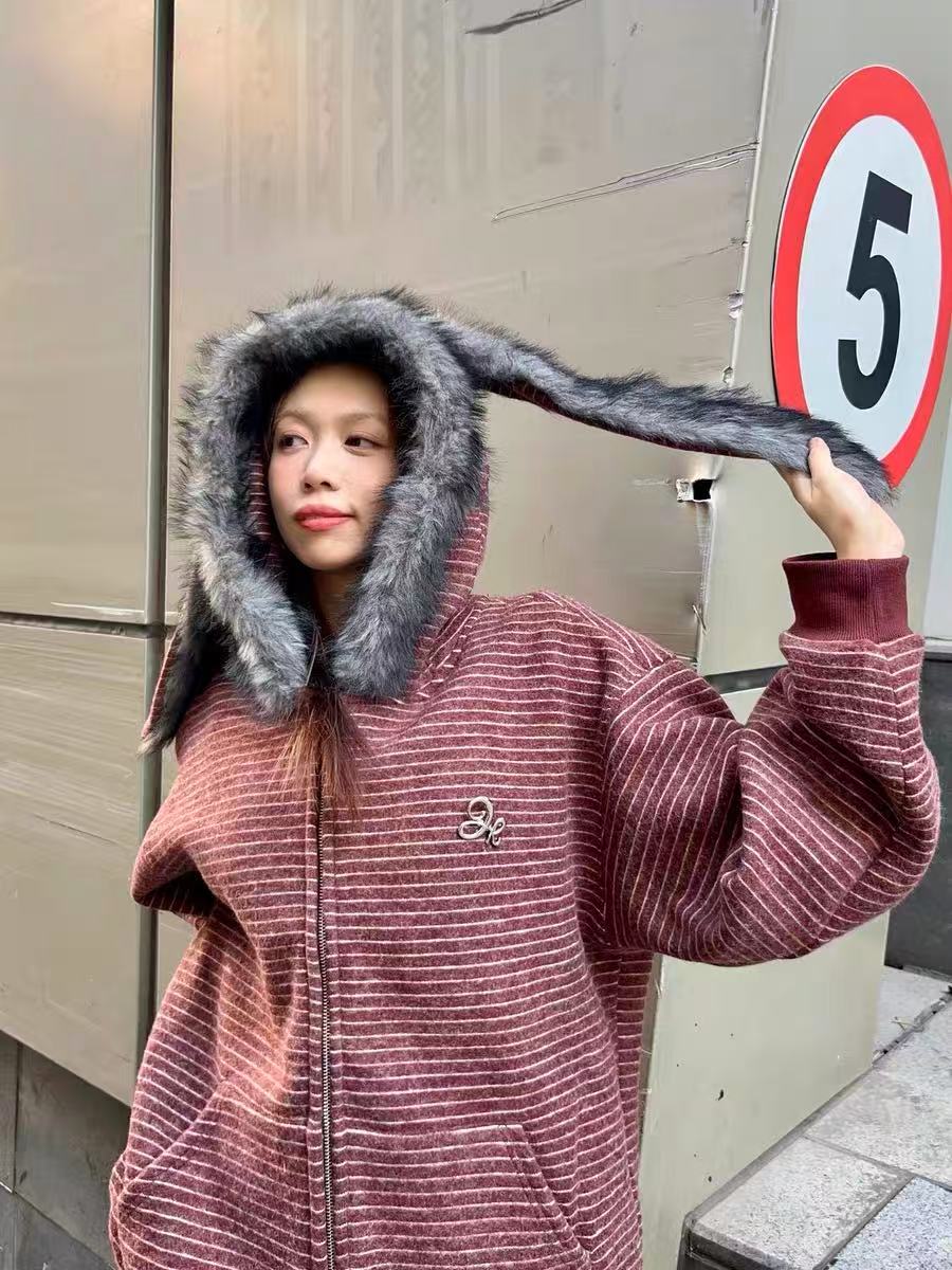 ふわふわのフェイクファーとバニー耳フードがアクセントになった、遊び心のあるストライプパーカー。
