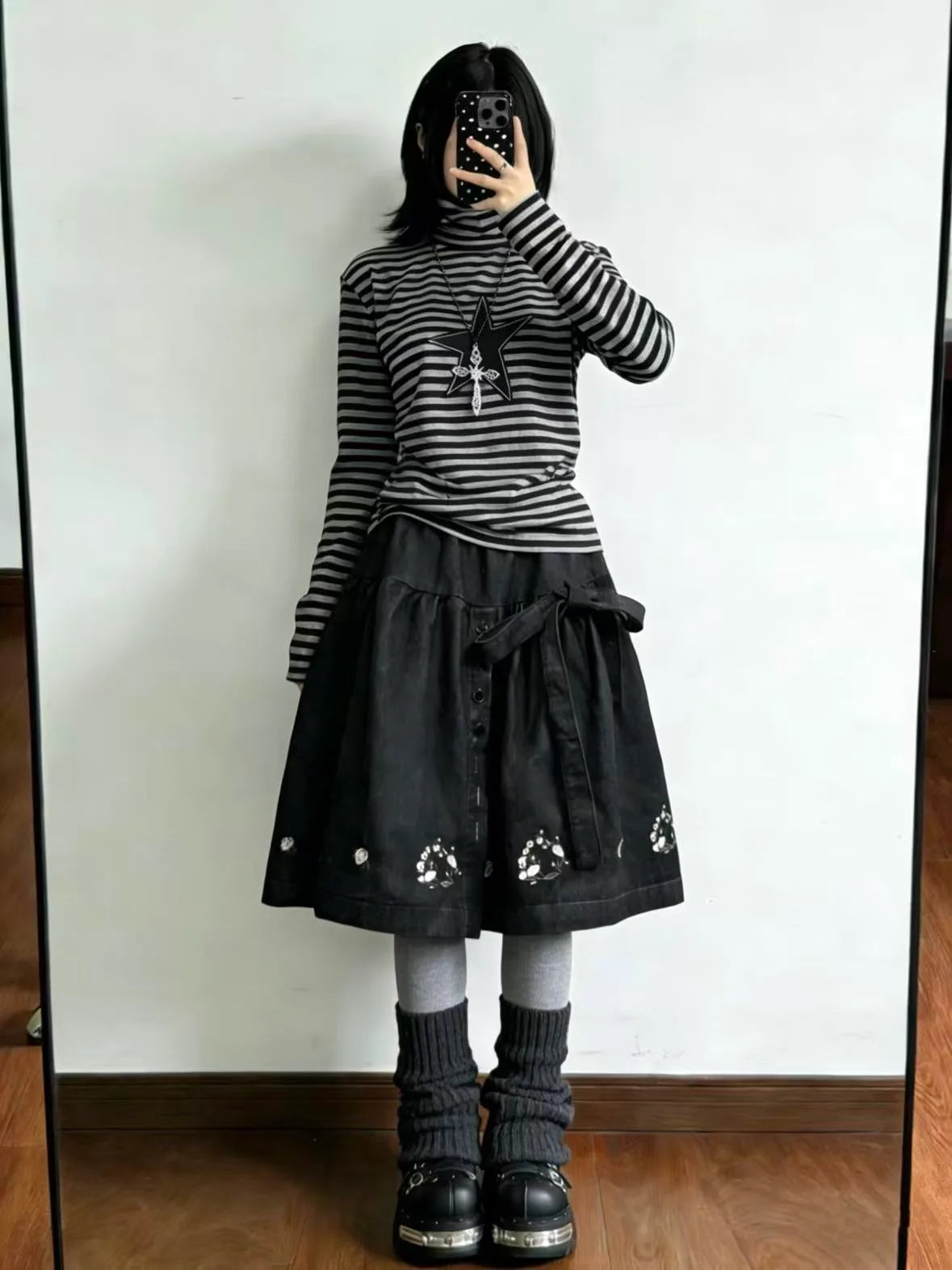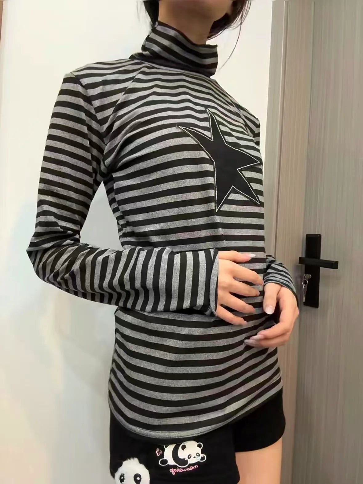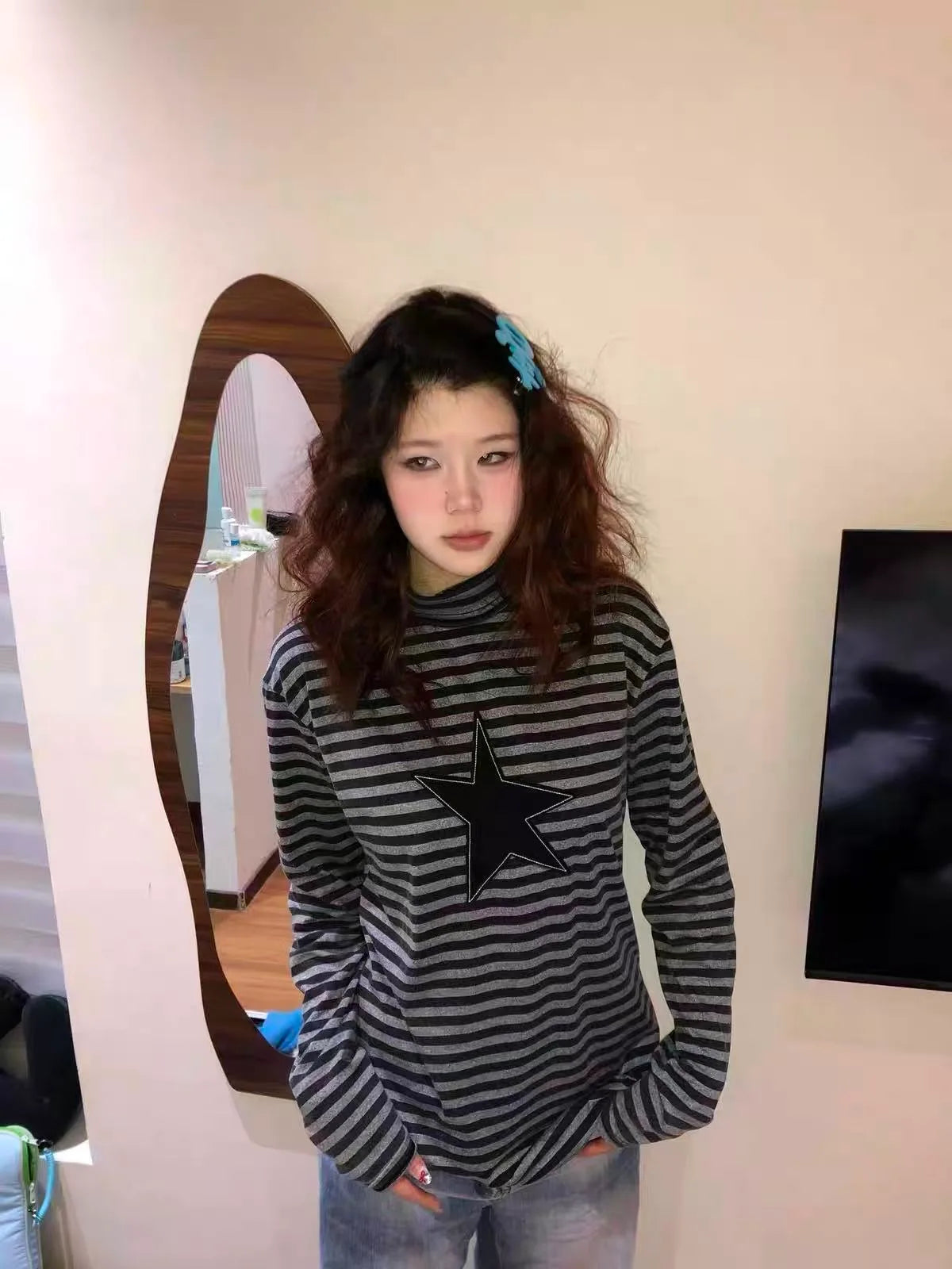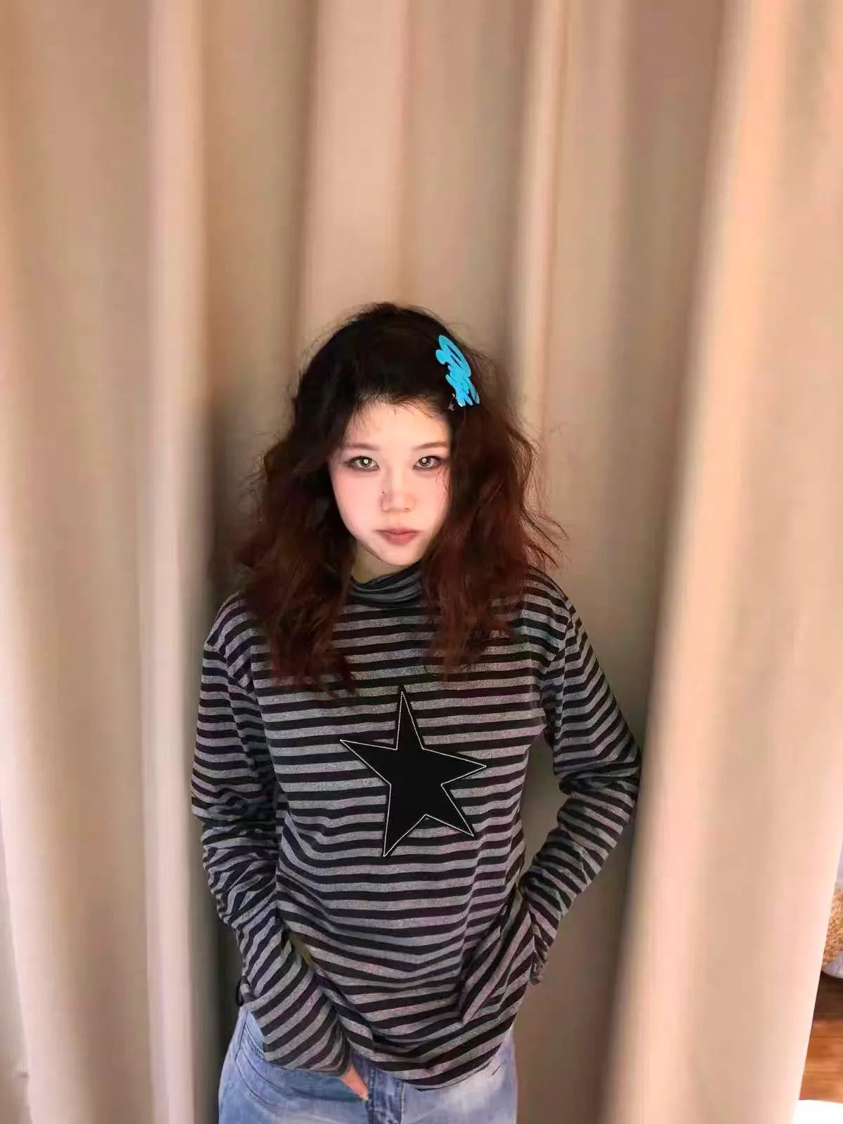 レトロ感のあるスター×ストライプ柄が目を惹く、モックネック仕様の長袖Tシャツ。