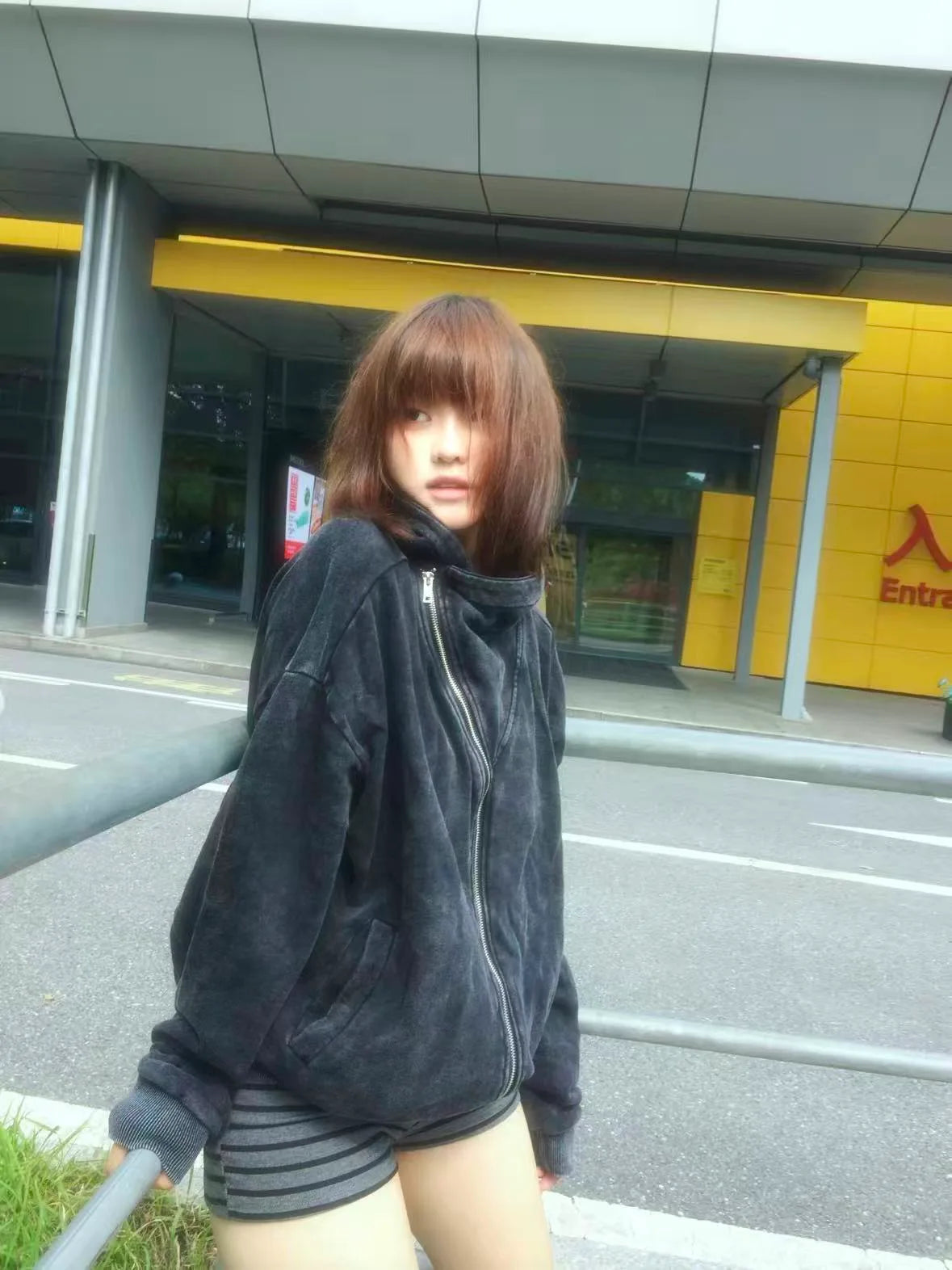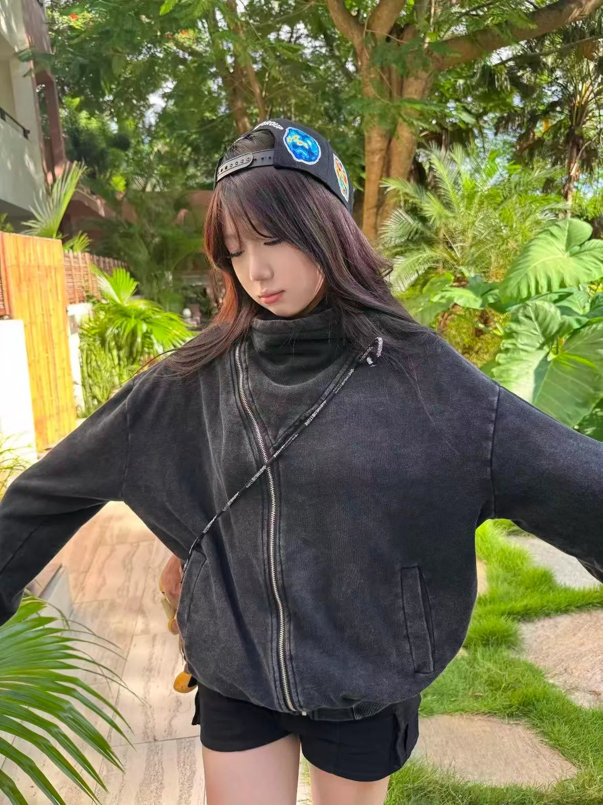 斜めジップのデザインがコーデにさりげない個性を加え、羽織るだけでこなれた印象に。