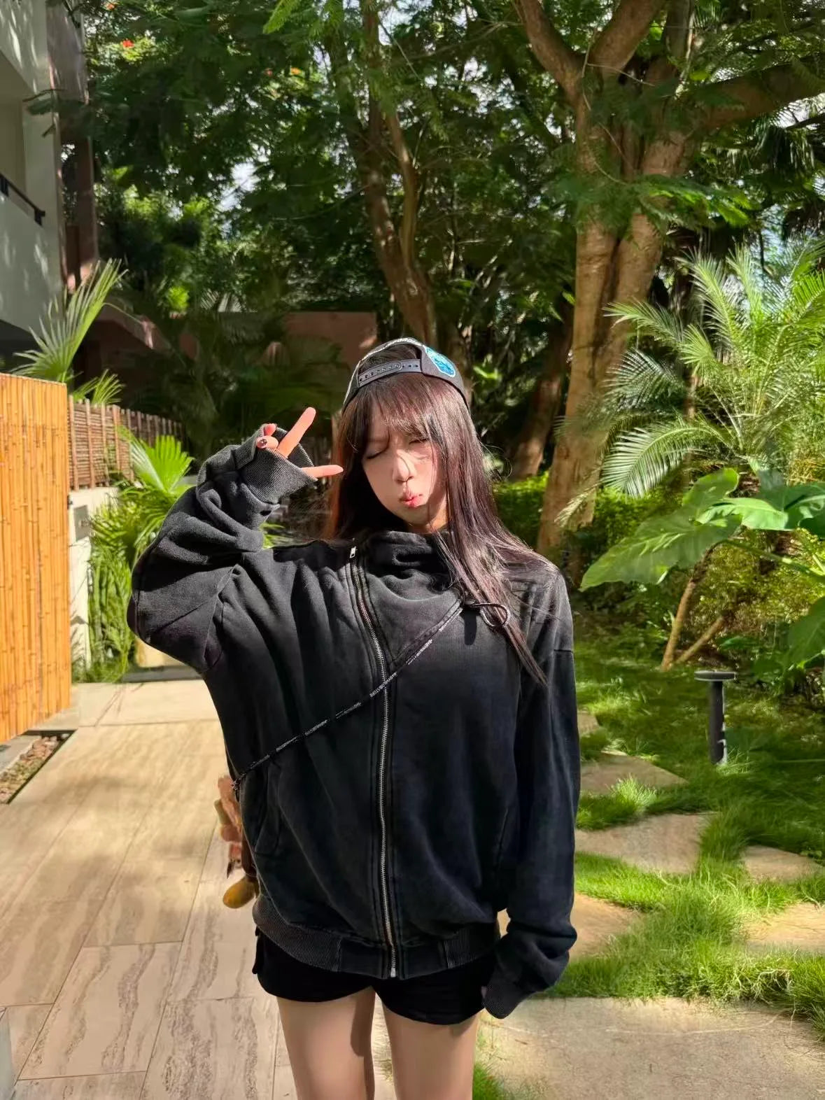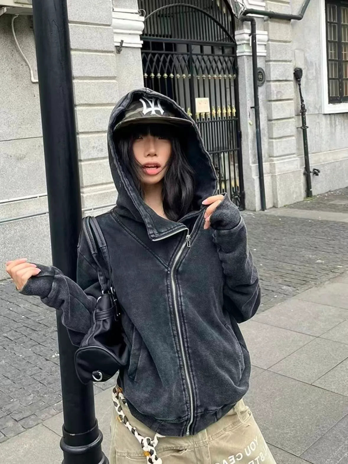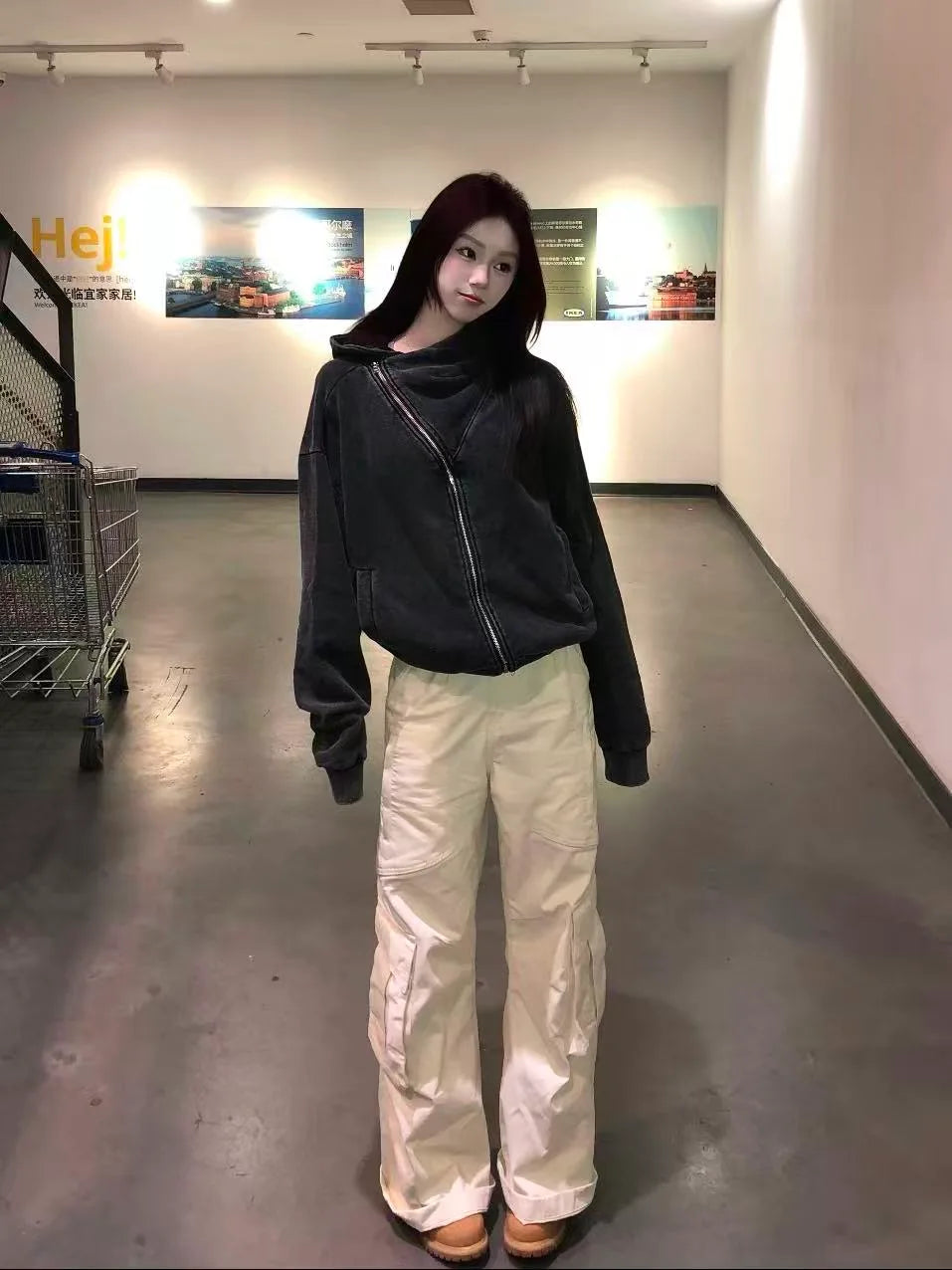 ゆったりとしたシルエットと高めのフードで、カジュアルながらも女性らしいバランスを演出します。